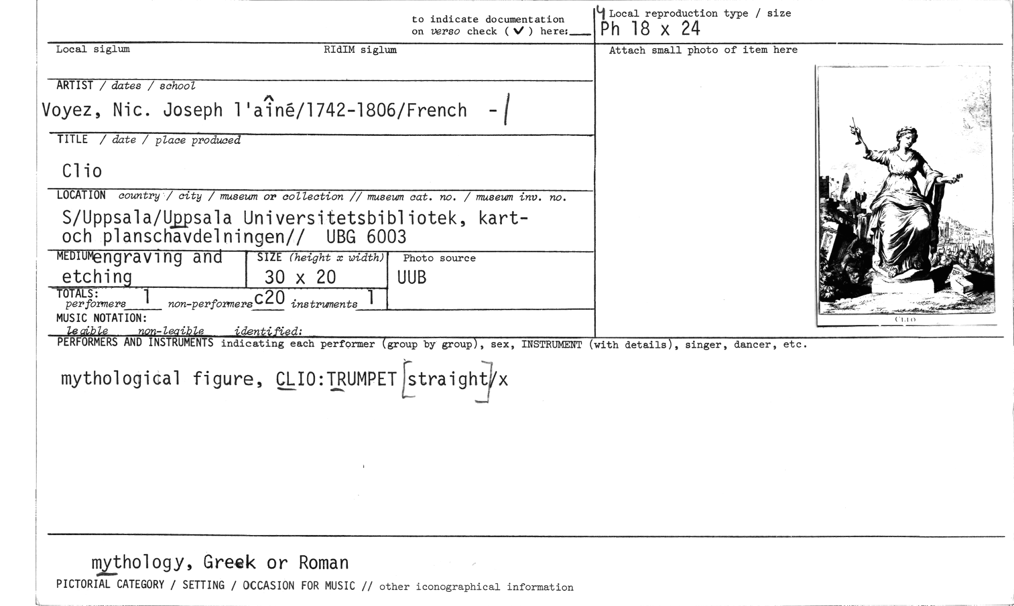 //// to indicate documentation //// on verso check ( V ) here:_ //// -1 Local reproduction type / size //// Ph 18 x 24 //// Local siglum RIdIM siglum //// ARTIST / dates / school //// Voyez, Nic. Joseph 1'aine1742-1806/French -I //// TITLE / date / place produced //// Attach small photo of item here //// Clio //// LOCATION country / city / museum or collection // museum cat. no. / museum inv. no. //// S/Uppsala/gusala Universitetsbibliotek, kart-och planschavdelningen// UBG 6003 //// mumume ngraving and SIZE (height x width) Photo source //// etching 30 x 20 UUB //// per formers non-perfbrmers C2° instruments 1 //// MUSIC NOTATION: //// le aible non-leaible identijied: //// PERFORMERS AND INSTRUMENTS indicating each performer (group by group), sex, INSTRUMENT (with details), //// -"TeirArS : 1 //// mythological figure, CLIO:TRUMPETEstraightkx //// singer, dancer, etc. //// Whology, Greek or Roman //// PICTORIAL CATEGORY / SETTING / OCCASION FOR MUSIC // other iconographical information ////