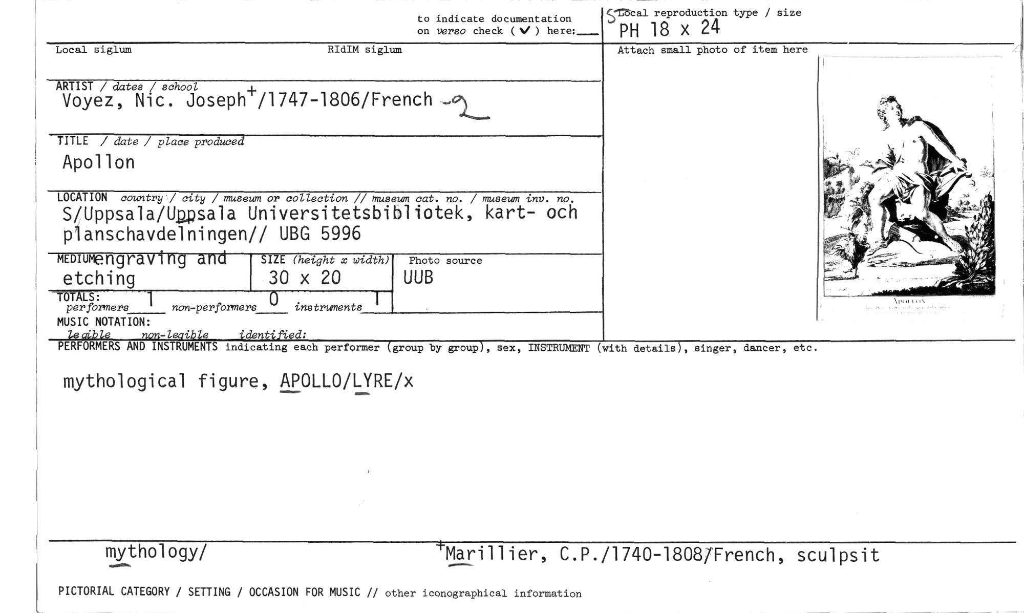 //// to indicate documentation //// on verso check ( ) here:_ //// StScal reproduction type / size //// PH 18 x 24 //// Local siglum RIdIM siglum //// ARTIST / dates / school //// Voyez, Nic. Joseph+/1747-1806/French //// 4-- //// TITLE / date / place produced //// Apollon //// LOCATION country / city / museum or collection // museum cat. no. / museum inv. no. //// S/Uppsala/Upsala Universitetsbibliotek, kart- och planschavdelningen// UBG 5996 //// Kmure ngraving and SIZE (height x width) Photo source //// etching 30 x 20 UUB //// TOTALS: //// per formers 1 non-perfbrmers instruments 1 //// MUSIC NOTATION: //// le oible non-leaible identi6ed: //// PERFORMERS AND INSTRUMENTS indicating each performer (group by group), sex, //// mythological figure, APOLLO/LYRE/x //// mythology/ 'Marillier, C.P./1740-1808/French, sculpsit //// PICTORIAL CATEGORY / SETTING / OCCASION FOR MUSIC // other iconographical information //// Attach small photo of //// INSTRUMENT (with details), singer, dancer, etc. ////