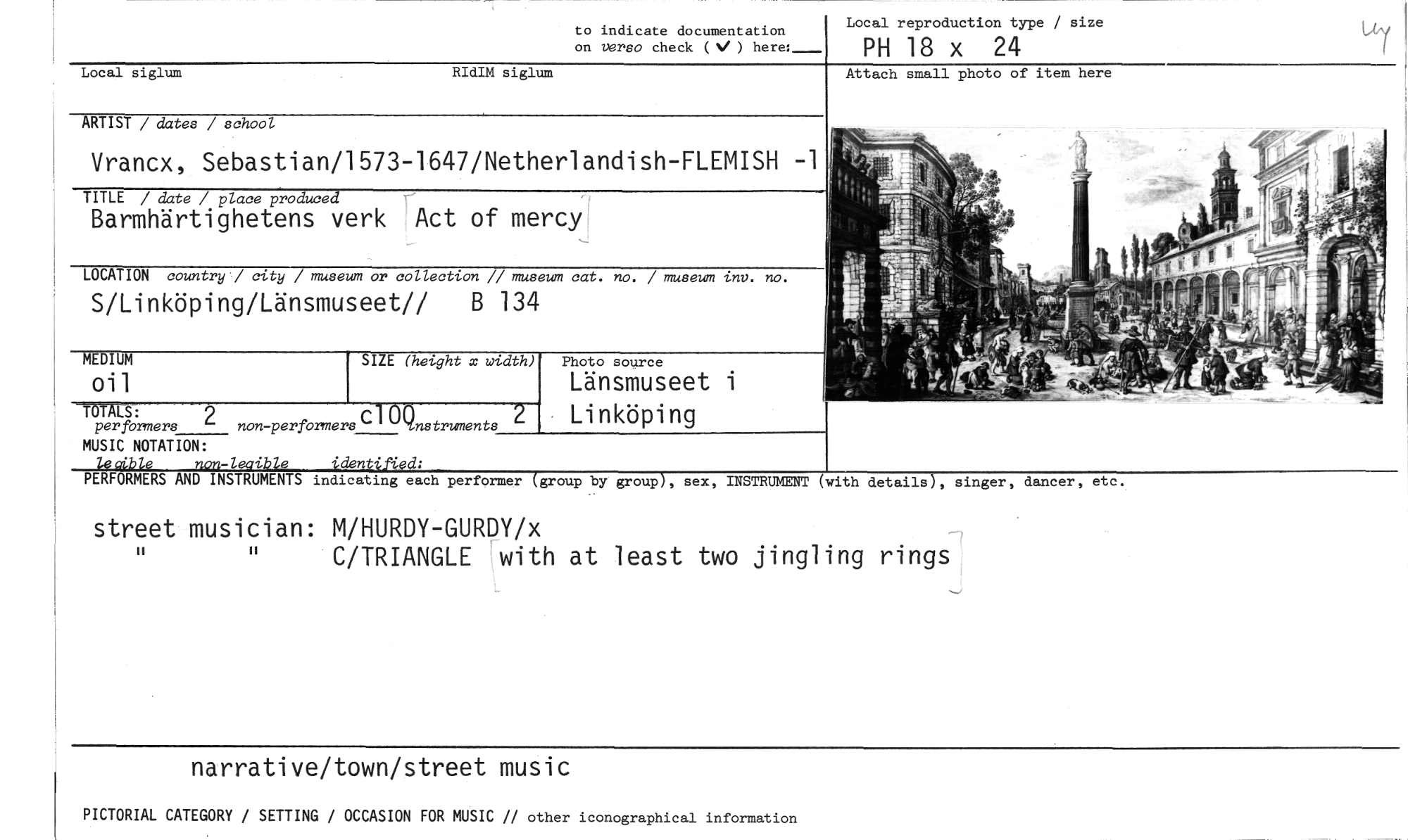//// to indicate documentation on versa check (V ) here: Local reproduction type / size //// PH 18 x 24 //// narrative/town/street music //// PICTORIAL CATEGORY / SETTING / OCCASION FOR MUSIC // other iconographical information //// Local siglum siglum //// ARTIST / dates / school //// Vrancx, Sebastian/1573-1647/Netherlandish-FLEMISH - //// TITLE / date / place produce //// Barmhärtighetens verk Act of mercy //// LOCATION country / city / museum or collection // museum cat. no. / museum inv. no. //// S/Linköping/Länsmuseet// B 134 //// //// MEDIUM SIZE (height x width) Photo source //// Oil Länsmuseet i Linköping //// TRÅLS :perfbrmers 2 non-perfbrmers El 0 ()I nstruments //// MUSIC NOTATION: //// leaible non-leoible identffied; //// Attach small photo of item here //// PERFORMERS AND INSTRUMENTS indicating each performer (group by group), sex, INSTRUMENT (with details), singer, dancer, etc. //// street musician: M/HURDY-GURDY/x //// C/TRIANGLE with at least two jingling rings ////