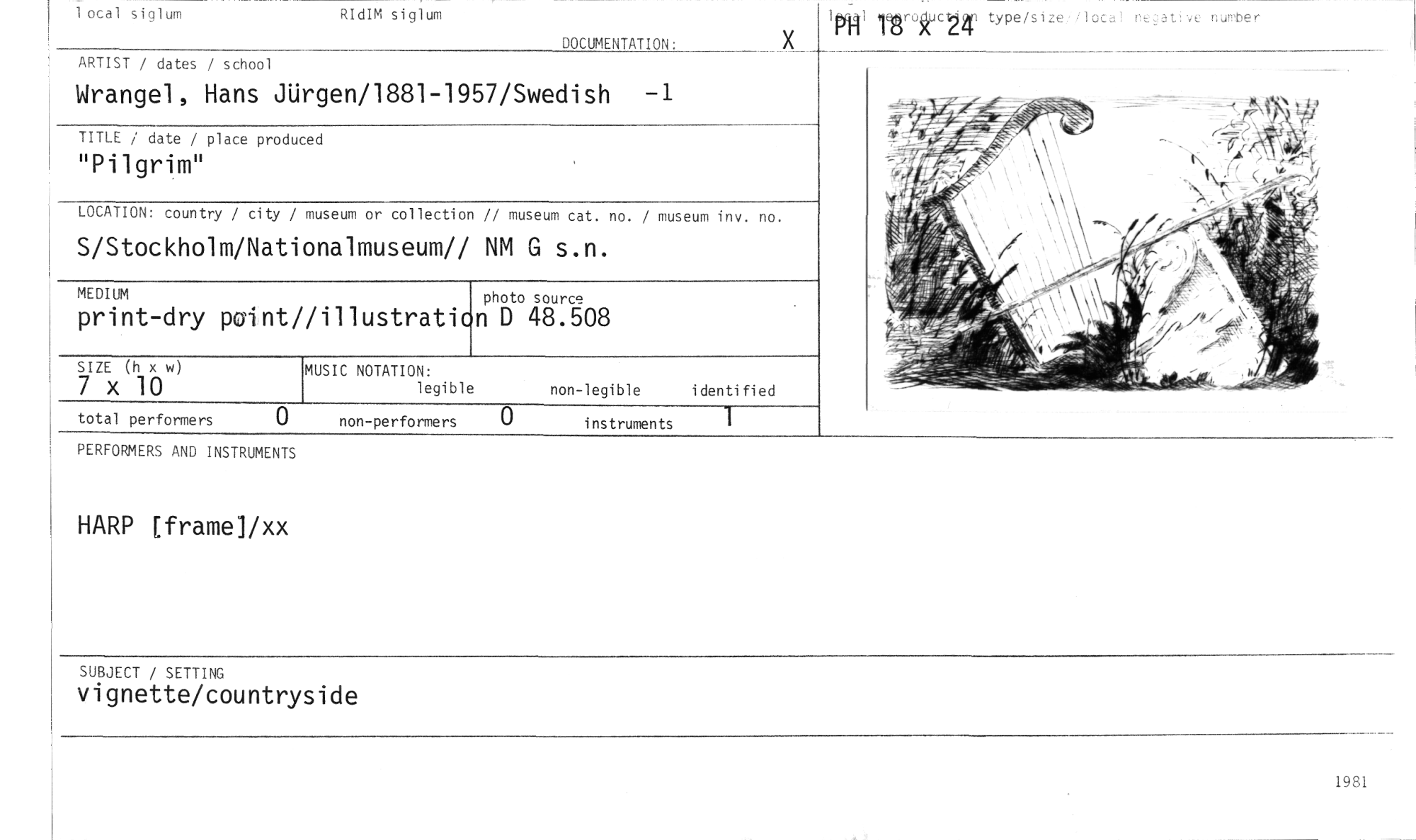 //// lotal siglum RIdIM siglum //// DOCUMENTATION //// ARTIST / dates / school //// Wrangel, Hans JUrgen/1881-1957/Swedish -1 //// TITLE / date / place produced //// "Pilgrim" //// LOCATION: country / city / museum or collection // museum cat. no. / museum inv. no. //// S/Stockholm/Nationalmuseum// NM G s.n. //// MEDIUM photo source //// print-dry point//illustratic n D 48.508 //// MUSIC NOTATION: //// non-performers 0 //// legible non-legible identified //// instruments r___ I664' 1Sr°Mt'ct2r type/size lotal reatIve nurober //// SIZE (h x w) //// 7 x 10 //// total performers 0 //// PERFORMERS AND INSTRUMENTS //// HARP [framel/xx //// SUBJECT / SETTING //// vignette/countryside //// 1981 ////