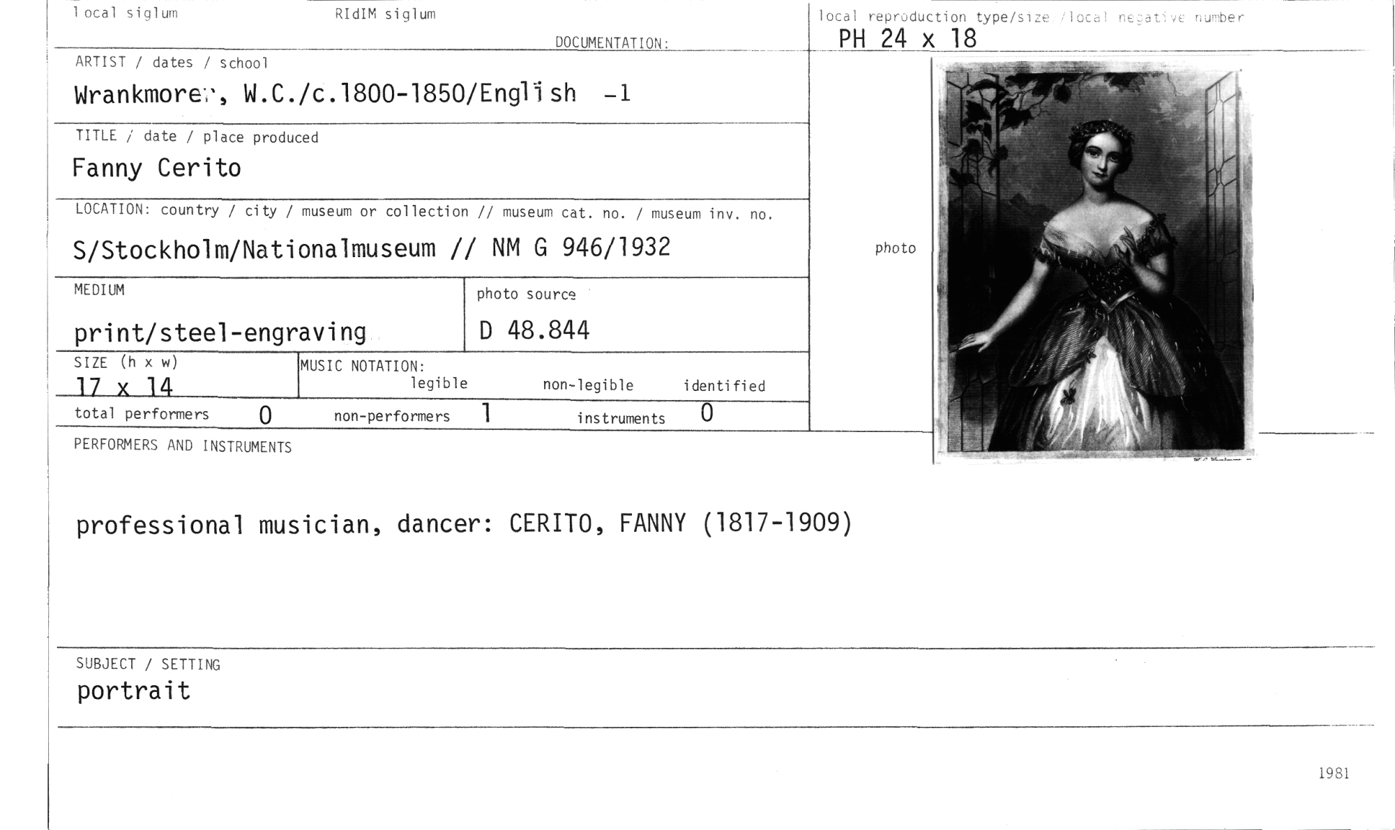//// 1 ocal siglum RIdIM siglum //// DOCUMENTATION //// lotal reproduction type/size ;lotal nesa-live nurober //// PH 24 x 18 //// photo //// MEDIUM //// print/steel-engr aving //// SIZE (h x w) //// 17 x 14 //// total performers 0 non-performers 1 instruments 0 //// PERFORMERS AND INSTRUMENTS //// professional musician, dancer: CERITO, FANNY (1817-1909) //// ARTIST / dates / school //// TITLE i date / place produ ced //// Fanny Cerito //// LOCATION: country / city / museum or collection // museum cat. no. / museum inv. no. //// S/Stockholm/Nati onalmuseum // NM G 946/1932 //// WrankmorE•, W.C. /c.1800-1850/English -1 //// photo source //// D 48.844 //// MUSIC NOTATION: //// legible non-legible Henti fi ed //// SUBJECT / SETTING //// portrait //// 1981 ////