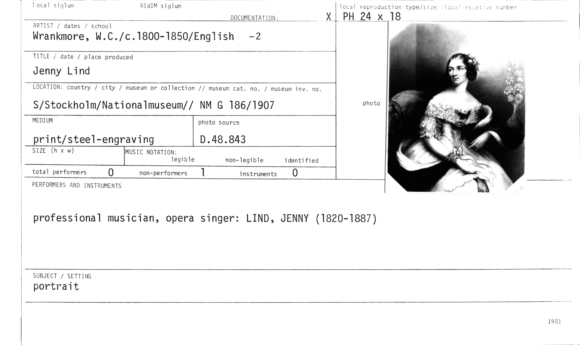 //// local siglum RIdIM siglum //// lotal reproduction type/size local negative number //// X PH 24 x 18 //// DOCUMENTATION: //// ARTIST / dates / school //// Wrankmore, W.C./c.1800-1850/English —2 //// TITLE / date / place produced //// Jenny Lind //// LOCATION: country / city / museum or collection // museum cat. no. / museum inv. no. //// S/Stockholm/Nationalmuseum// NM G 186/1907 //// photo //// photo source //// D.48.843 //// MUSIC NOTATION: //// legible //// non-legible identified //// instruments 0 //// PERFORMERS AND INSTRUMENTS //// professional musician, opera singer: LIND, JENNY (1820-1887) //// SUBJECT / SETTING //// portrait //// 1981 ////