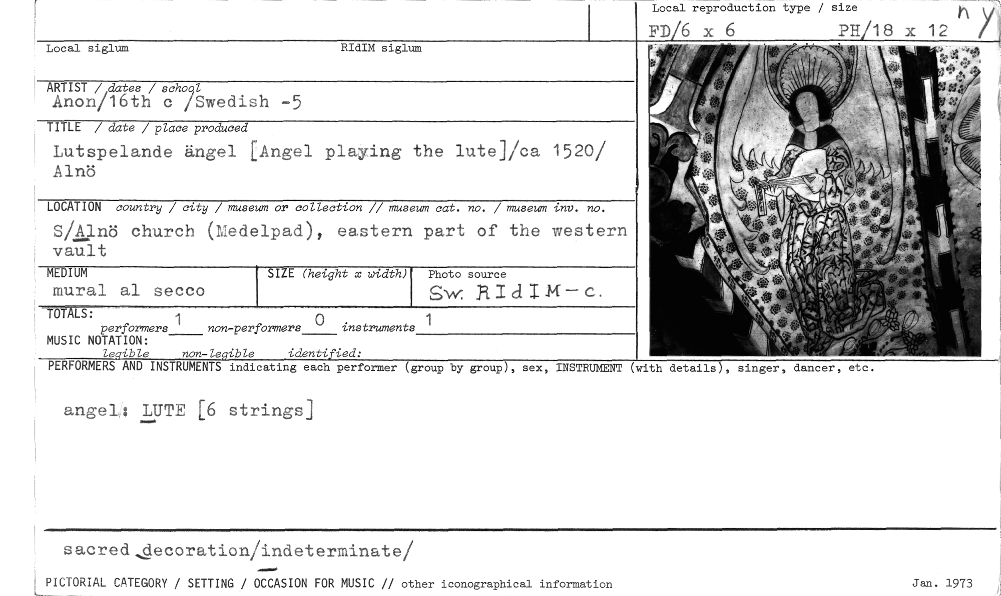 //// non-performers 0 //// 1 //// instruments //// perförmers //// MUSIC NOTATION: //// legible non-legible identified: //// SIZE (height x width) //// MEDIUM //// mural al secco //// Photo source //// Sw 19. i cl — c • //// details), singer, dancer, etc. //// PERFORMERS AND INSTRUMENTS indicating each performer (group by group), sex, INSTRUMENT (with //// angel: LUTE [6 strings] //// Jan. 1973 //// sacred decoration/indeterminate/ //// PICTORIAL CATEGORY / SETTING / OCCASION FOR MUSIC // other iconographical information //// Local siglum RIdIM siglum //// ARTIST /,dates / schoql //// Anon/16th c /Swedish -5 //// TITLE / date / place produced //// Lutspelande ängel [Angel playing the lute]/ca 1520/ Alnö //// LOCATION country / city / museum or collection // museum cat. no. / museum 2nV. no. //// S/Alnö church (Medelpad), eastern part of the western vault //// Local reproduction type / size //// I //// FD/6 x 6 PH/18 x 12 //// 4'11: ////