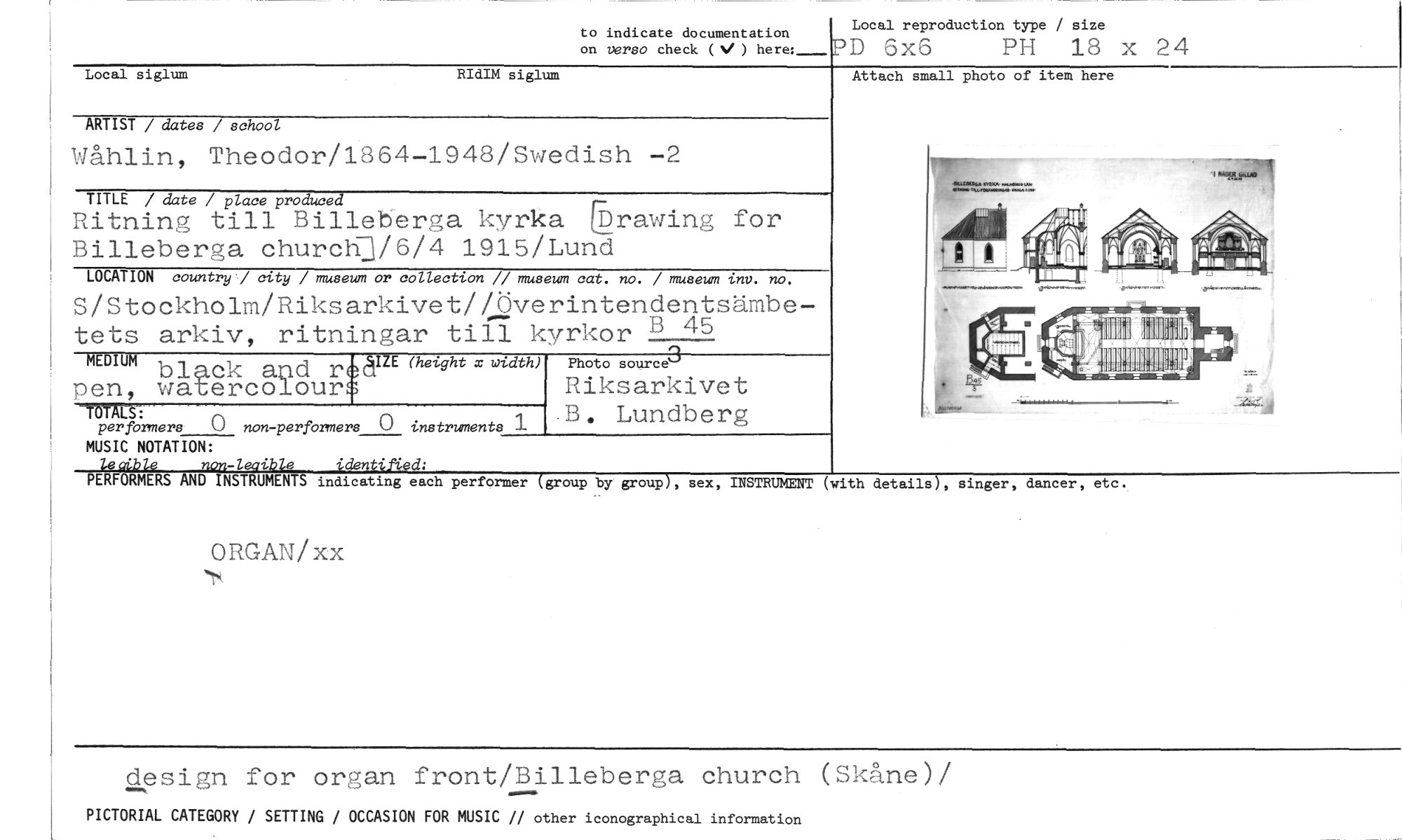 //// to indicate documentation //// on verso check (N/ ) here:_ //// Local reproduetion type / size //// PD 6x6 PH 18 x 24 //// Local siglum RIdIM siglum //// ARTIST / dates / school //// Wåhlin, Theodor/1864-1948/Swedish -2 //// TITLE / date / place produced //// Ritning till Billeberga kyrka EDrawing for Billeberga ehurchp/6/4 1915/Lund //// LOCATION country / city / museum or collection // museum cat. no. / museum inv. no. //// S/Stockholm/Riksarkivet//Överintendentsämbetets arkiv, ritningar till kyrkor B 45 //// MEDIUMeUE~ zo //// (height Pnoto~ce //// black and rea //// pen, watercolours Riksarkivet //// i • 13. Lundberg //// ~mera 0 non~mers 0 instruments -4 //// Attach small photo of i em here //// MUSIC NOTATION: //// lefble non-leaible identiMd; //// PERF RMERS AND INSTRUMENTS indicating each performer (group by group), sex, INSTRUMENT (with details), singer, dancer, etc. //// ORGAN/xx //// design for organ front/Billeberga church (Skåne)/ //// PICTORIAL CATEGORY / SETTING / OCCASION FOR MUSIC // other iconographical information ////