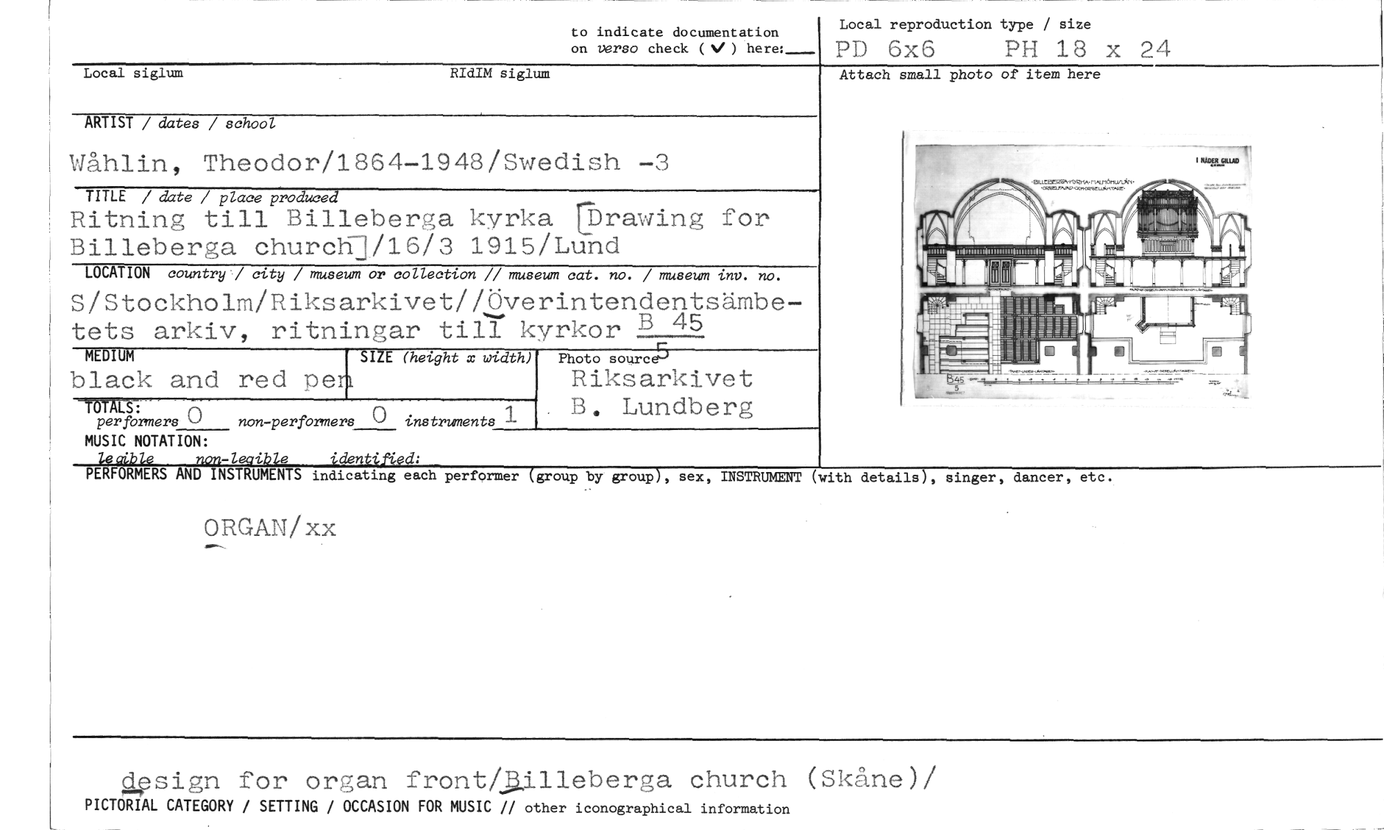 //// to indicate documentation //// on verso check (V ) here:_ //// Local reproduction ty-ps / size //// PD 6x6 PH 18 x 24 //// Local siglum RIdIM siglum //// ARTIST / dates / school //// Wåhlin, Theodor/1864-1948/Swedish -3 //// TITLE / date / place produced //// Ritning till Billeberga kyrka Ebrawing for Billeberga church1/16/3 1915/Lund //// LOCATION country :/ city / museum or collection // museum cat. no. / museum inv. no. //// S/Stockholm/Riksarkivet/Mverintendentsämbetets arkiv, ritningar till kyrkor B 45 //// MEDIUM SIZE (height x width) Photo sourceJ //// black and red pen Riksarkivet //// B. Lundberg //// ORGAN/xx //// Attach small photo of item here //// "MÅLS: //// per formers C) non -performers 0 instruments //// MUSIC NOTATION: //// uale non -leaible identified: //// PE FORMERS AND INSTRUMENTS indicating each performer (group by group), sex, INSTRUNT (with details), singer, dancer, etc. //// asign for organ front/itilleberga church (Skåne)/ //// PICTORIAL CATEGORY / SETTING / OCCASION FOR MUSIC // other iconographical information ////