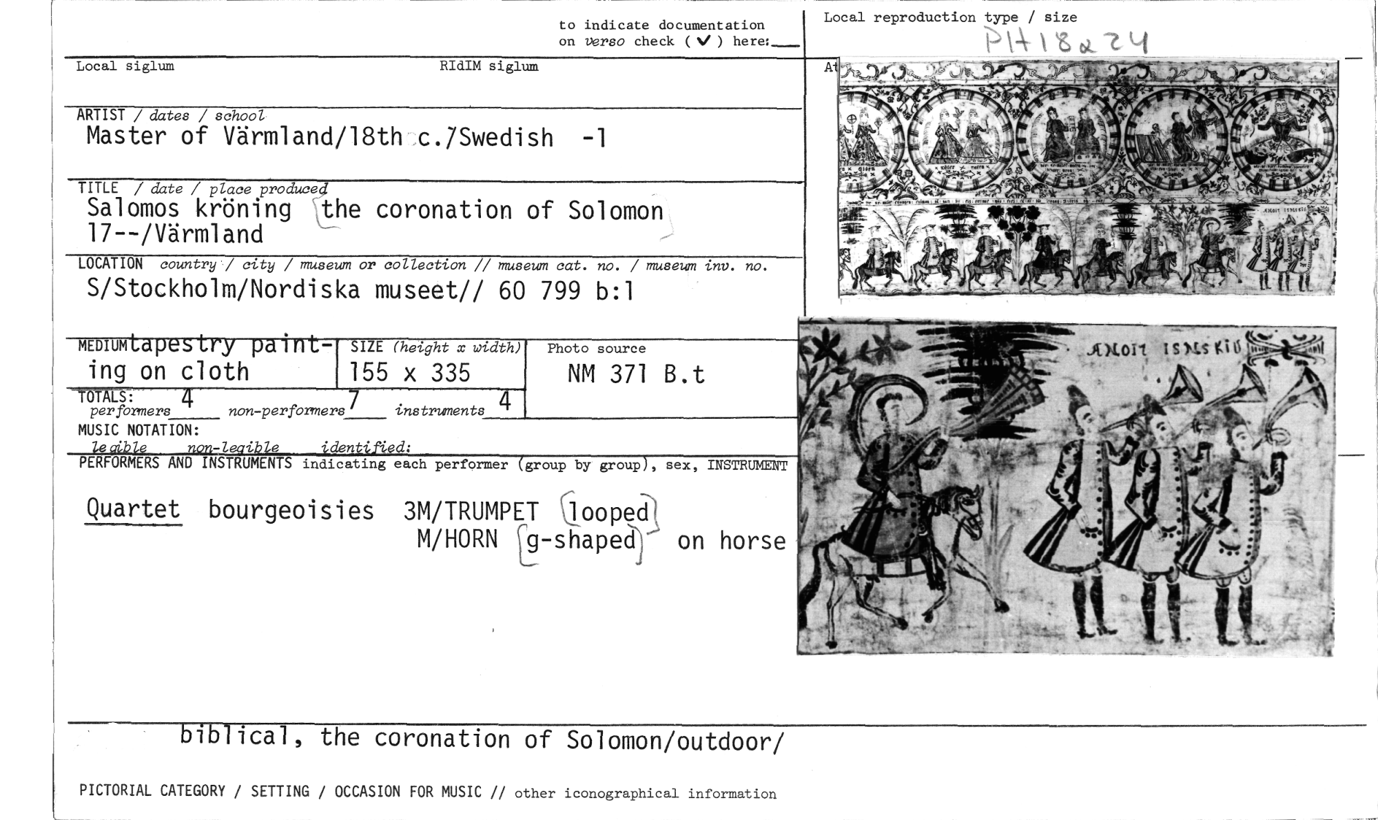 //// sh tt i //// to indicate documentation //// on verso check ( %, ) here: //// ARTIST / dates / school //// Master of Värmland/18th c.7Swedish -1 //// TITLE / date / place produced //// Salomos kröning ',the coronation of Solomon 17--/Värmland //// LOCATION country / city / museum or collection // museum cat. no. / museum inv. no. //// S/Stockholm/Nordiska museet// 60 799 b:1 //// Local reproduction type / size //// k-k, os ot //// per formers non-performers7 instruments_ //// Ar- //// —rurre7-4 //// MUSIC NOTATION: //// lealble non-leaible identified: //// PERFORMERS AND INSTRUMENTS indicating each performer (group by group), sex, INSTRUMENT //// Quartet bourgeoisies 3M/TRUMPET ;loopet //// M/HORN _g-shapeCI) on horse //// biblical, the coronation of Solomon/outdoor/ //// PICTORIAL CATEGORY / SETTING / OCCASION FOR MUSIC // other iconographical information //// EDIUM //// .9- Y •. //// IZE (height x width) //// ing on cloth 155 x 335 //// NM 371 B.t //// A>Coil is>iSKilf //// xr—o. //// • i //// Photo source ////