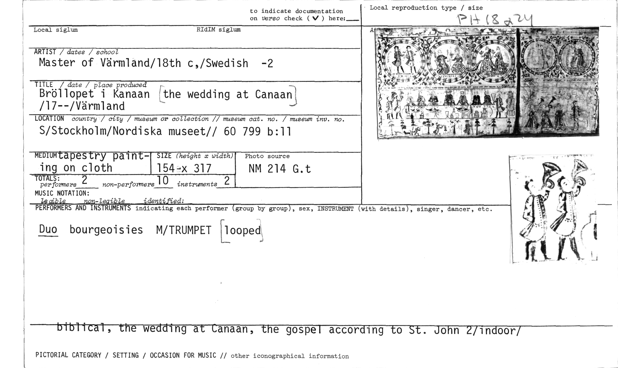 //// to indicate documentation //// on Verso check (V) here:_ //// Local reproduction type / size //// 1.> 1-55- . //// Local siglum RIdIM siglum //// ARTIST / dates / school //// Master of Värmland/18th c,/Swedish -2 //// TITLE / date / place produced //// Bröllopet i Kanaan Lthe wedding at Canaan /17--/Värmland //// LOCATION country / city / museum or collection // museum cat. no. / museum inv. no. //// S/Stockholm/Nordiska museet// 60 799 b:11 //// MEDIUM tapestry paint- SIZE (height x width) //// Photo source //// ing on cloth 154-x 317 //// NM 214 G.t //// -TOTAIS: 2 10 instruments per formers non-performers truments //// MUSIC NOTATION: //// ,o, 1.• p e 'den ied: //// PERFORMERS AND INSTRUMENTS indicating each performer (group by group), sex, INSTRUMENT (with details), singer, dancer, etc. //// Duo bourgeoisies M/TRUMPET //// looped, //// iblical, the wedding at Canaan, the gospel according to St. John 2/indoorj //// PICTORIAL CATEGORY / SETTING / OCCASION FOR MUSIC // other iconographicai information ////