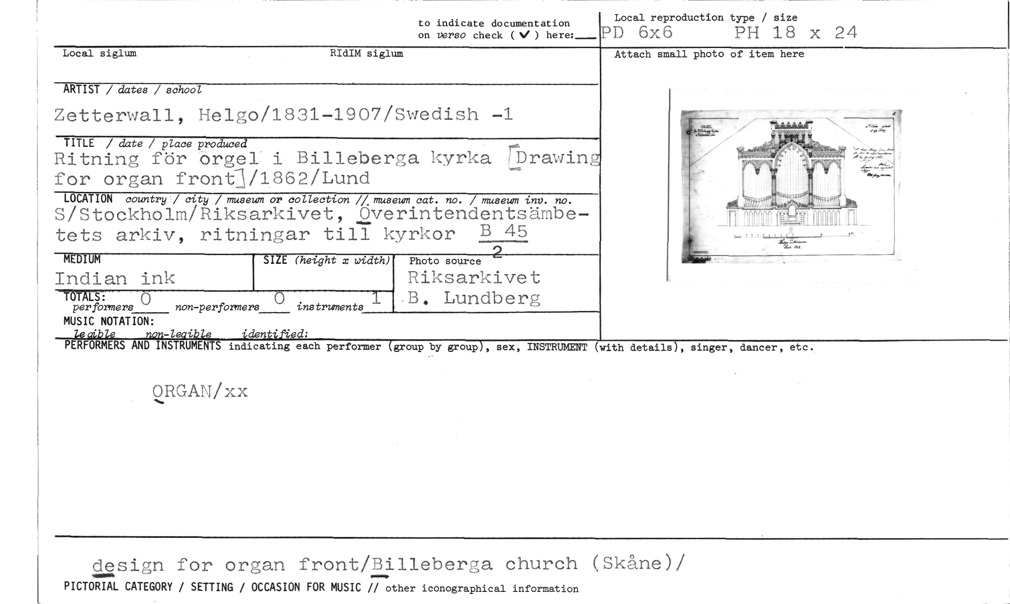 //// to indicate documentation //// on verso check ( ) here:_ //// Local reproduction type / size //// PD 6x6 PH 18 x 24 //// Local siglum RIdIM siglum //// ARTIST / dates / school //// Zetterwall, Helgo/1831-1907/Swedish -1 //// TITLE / date / place produced //// Ritning för Orgel i Billeberga kyrka rDrawinT for organ front-Y1862/Lund //// Attach small photo of item here //// LOCATION country / city / museum or collection // museum cat. no. / museum inv. no. //// S/Stockholm/Riksarkivet, Ove rintendentsämbetets arkiv, ritningar till kyrkor B 45 //// MEDIUM //// Indian ink //// TOTALS: //// performers non -performers instruments //// 0 0 //// MUSIC NOTATION: //// leaible non-leaible identified: //// Photo source //// Riksarkivet //// B. Lundberg //// SIZE (height x width) //// 2 //// PERFORMERS AND INSTRUMENTS indicating each performer (group by group), sex, INSTRUMENT (with details), singer, dancer, etc. //// ORGAN/xx //// design for organ front/Billeberga church (Skåne)/ //// PICTORIAL CATEGORY / SETTING / OCCASION FOR MUSIC // other iconographical information ////