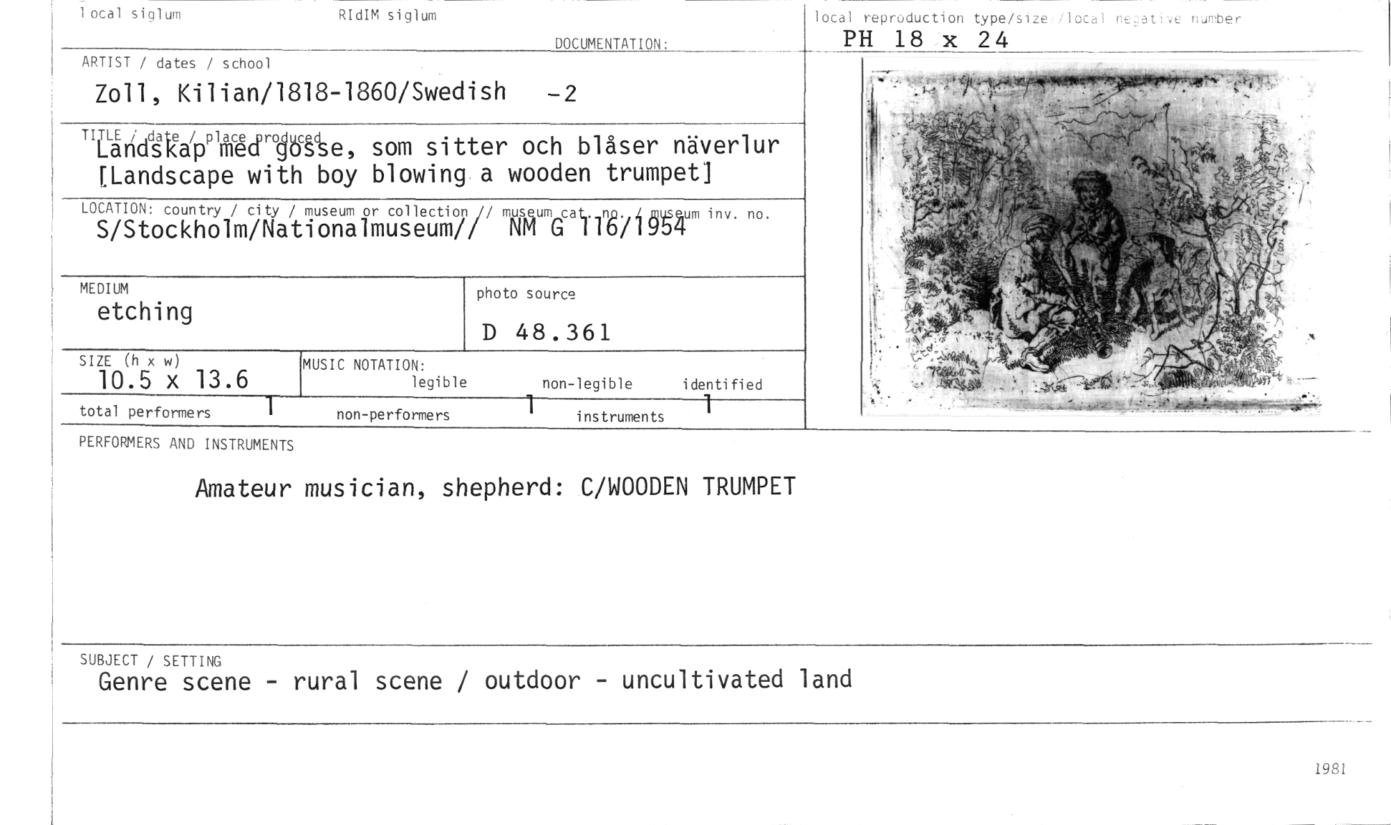 //// 1 ocal siglum RIdIM siglum //// DOCUMENTATION: //// local reproduction type/size71( ntDgative number //// PH 18:x 24 //// ARTIST / dates / school //// Zoll, Kilian/1818-1860/Swedish -2 //// TILIAVaPplilientffie, som sitter och blåser näverlur (Landscape with boy blowing a wooden trumpet] //// LOCATION: country / city / museum or collection .// museum cat. no. L mus4um inv. no. //// S/Stockholm/Nationalmuseum// NM G 116/195 //// photo source //// MEDIUM //// etching //// D 48.361 //// SIZE (h x w) //// 10.5 x 13.6 //// 1 //// MUSIC NOTATION: //// legible non-legible identified //// 1 //// non-performers instruments //// total performers //// PERFORMERS AND INSTRUMENTS //// Amateur musician, shepherd: C/WOODEN TRUMPET //// SUBJECT / SETTING //// Genre scene - rural scene / outdoor - uncultivated land //// 1981 ////