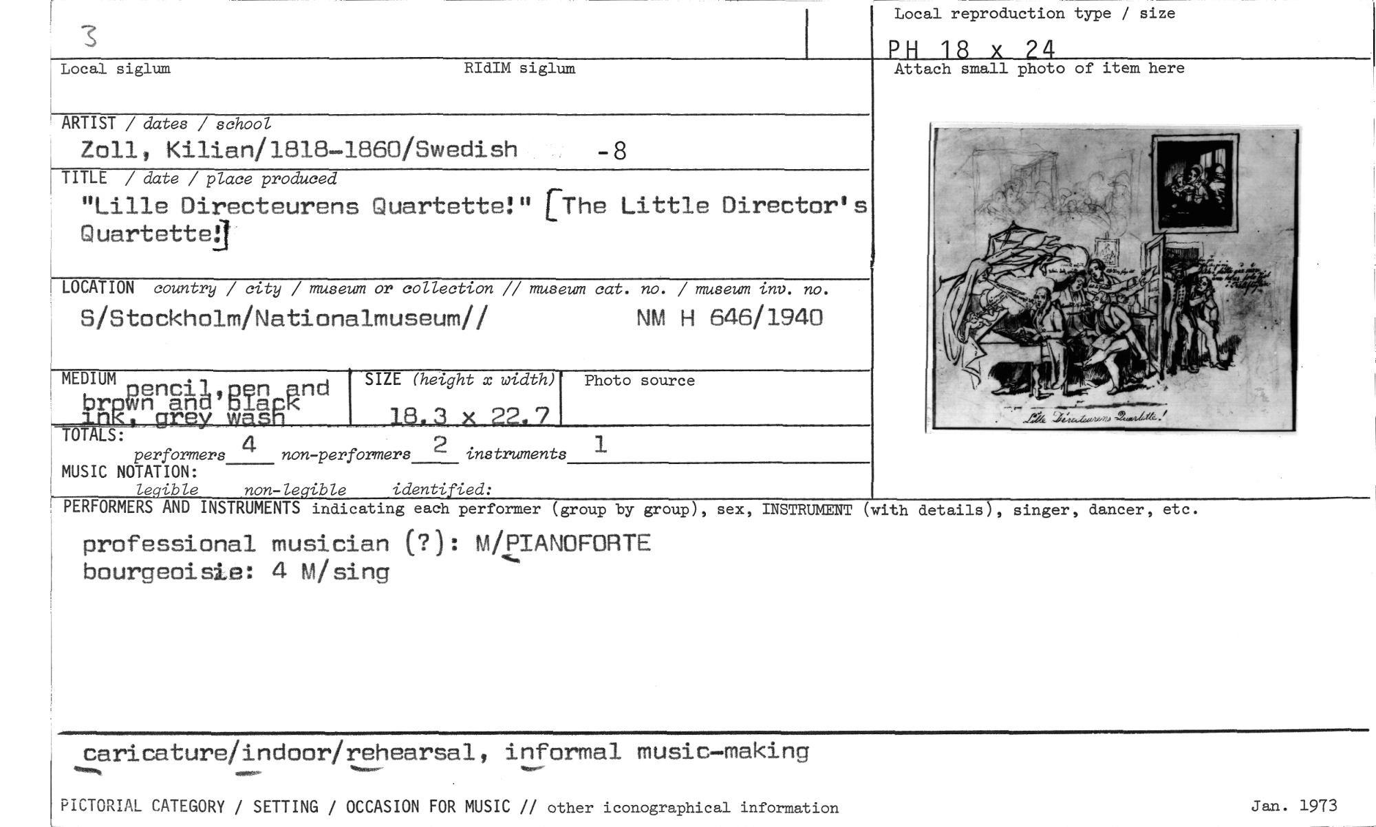//// Local reproduction type / size //// PH 18 x 24 //// Attach small photo of item here //// ARTIST / dates / school //// Zoll, Kilian/1818-1860/Swedish -8 //// TITLE / date / place produced //// "Lille Directeurens Quartette!" [The Little Director's Quartette; //// LOCATION country / city / museum or collection // museum cat. no. / museum ini,. no. //// S/Stockholm/Nationalmuseum// NM H 646/1940 //// MEDIUM SIZE (height x width) Photo source //// oencil,nen and //// brpwn ana biaGK //// ___241K ..._ctrey _was 18.3 x 22.7 //// TOTALS: //// performers 4 non-performers 2 instruments //// 1 //// MUSIC NOTATION: //// legible non-lecible identified: //// PERFORMERS AND INSTRUMENTS indicating each performer (group by group), sex, INSTRUMENT (with details), singer, dancer, etc. //// professional musician (?): M/PIANOFORTE bourgeoisie: 4 M/sing //// caricature/indoor/rehearsal, informal music—making //// Local siglum RIdIM siglum //// PICTORIAL CATEGORY / SETTING / OCCASION FOR MUSIC // other iconographical information Jan. 1973 ////