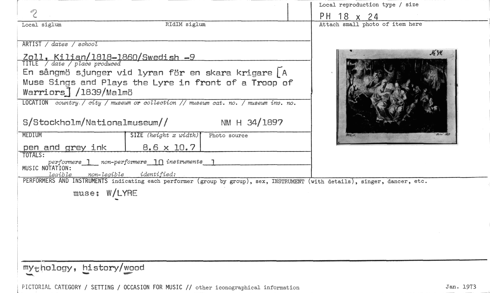 //// Local reproduction type / size //// PH 18 x 24 //// Local siglum RIdIM siglum //// ARTIST / dates / school //// Zo TLEn, dKilian/18 od18— ed1860/Swedish —9 //// TI / ate / place pruc //// En sångmö sjunger vid lyran för en skara krigare 1A Muse Sings and Plays the Lyra in front of a Tropp of Warriorsj /1839/Malmö //// LOCATION country./ city / museum or collection // museum cat. no. / museum inv. no. //// S/Stockholm/Nationalmuseum// NM H 34/1897 //// SIZE (height x width) //// 8.6 x 10.7 //// Attach small photo of item here //// MEDIUM //// en and qrey ink //// Photo source //// TOTALS: //// performers_l_ non -performers__113 instruments 1 //// MUSIC NOTATION: //// legible non-legible identified: //// PERFORMERS AND INSTRUMENTS indicating each performer (group by group), sex, INSTRUMENT (with details), singer, dancer, etc. //// rause: W/LYRE //// mYthology, history/wood //// PICTORIAL CATEGORY / SETTING / OCCASION FOR MUSIC // other iconographical information Jan. 1973 ////