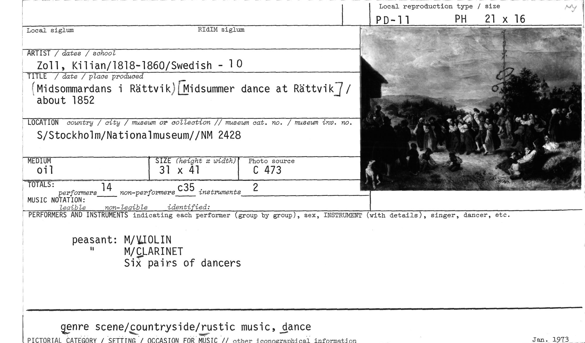 //// Jan. 1973 //// genre scene/countryside/rustic music, dance //// PICTORTAL CATEGORY / SETTING / OCCASION FOR MUSIC // other ioonozranhical information //// Local reproduction type / size //// P D-1 1 PH 21 x 16 //// Local siglum RIdIM siglum //// ARTIST / dates / school //// Zoll, Kilian/1818-1860/Swedish - 10 //// TITLE / date / place produced //// (Midsommardans i Rättvik)glidsummer dance at RättvikI7/ about 1852 //// LOCATION country / city / museum or collection // museum cat. no. museum tnv. no. //// S/Stockholm/Nationalmuseum//NM 2428 //// MEDIUM //// Oil //// SIZE (hetght x width) //// 31 x 41 //// Photo source //// C 473 //// performersnon-performers instruments //// MUSIC NOTATION: //// legible non-legible identified: //// PERFORMERS AND INSTRUMENTS indicating each performer (group //// peasant: MaJOLIN //// M/CLARINET //// Six pairs of dancers //// 2 //// TOTALS: 14 c35 //// by group), sex, INSTRUMENT (with details), singer, dancer, etc. ////
