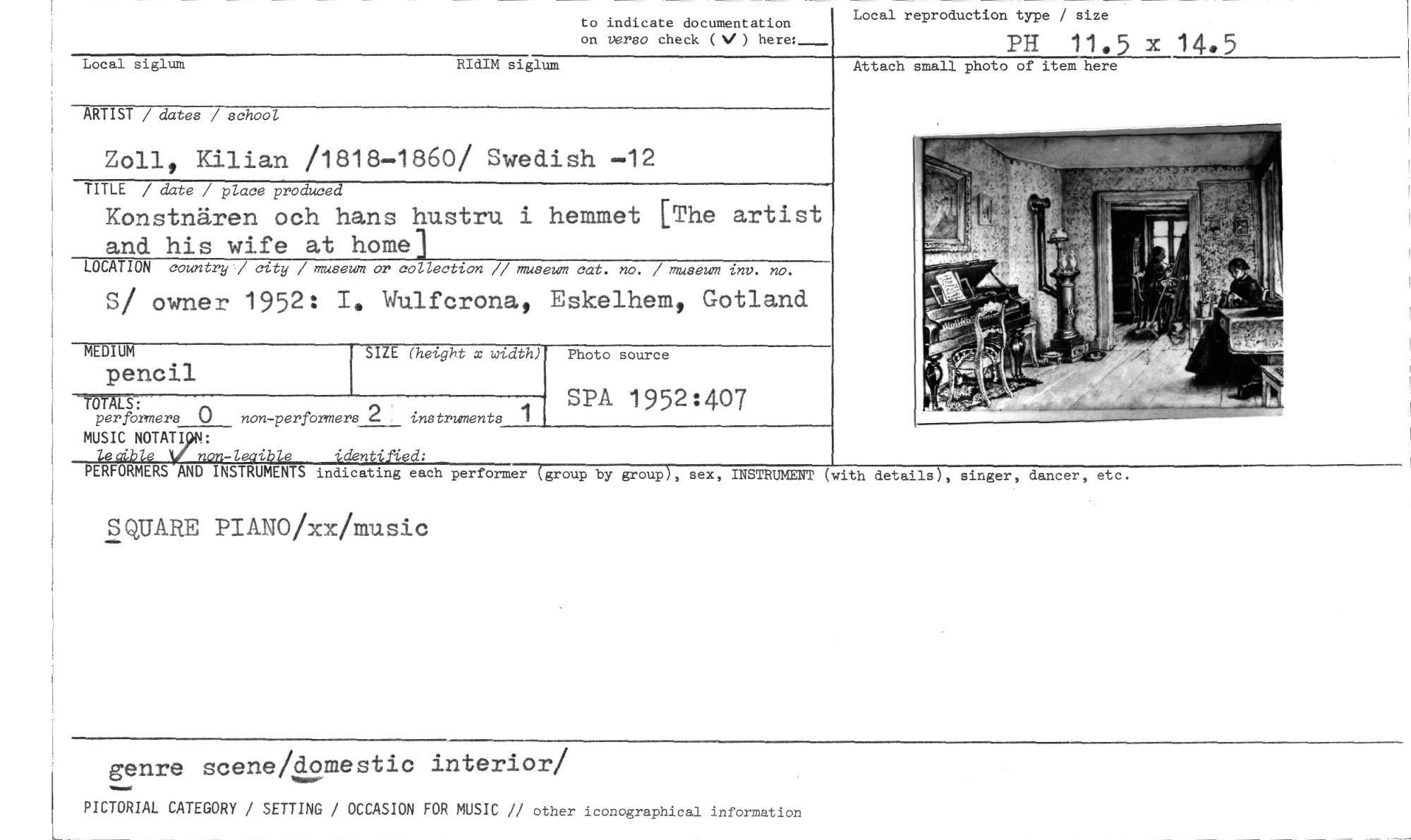 //// SQUARE PIANO/xx/music //// Attach small photo of item here //// SIZE (height x width) //// Photo source //// WLS:— //// per formers 0 //// SPA 1952:407 //// non-perfbrmers 2 instruments 1 //// Local siglum //// RIdIM siglum //// ARTIST / dates / school //// Zon., Kilian /1818-1860/ Swedish —12 //// TITLE / date / place produced //// Konstnären och hans hustru i hemmet [The artist //// and his wife at home] //// LOCATION country / city / museum or collection // museum cat. no. / museum inv. no. //// S/ owner 1952: I. Wulfcrona, Eskelhem, Gotland //// MEDIUM //// pencil //// to indicate documentation //// on verso check (%, ) here: //// Local reproduction type / size //// PH 11. x 14.5 //// MUSIC NOTATI : //// non-leaible idsntified: //// PERFORMERS AND INSTRUMENTS indicating each performer (group by group), sex, INSTRUMENT //// (with details), singer, dancer, etc. //// genre scene/domestic interior/ //// •^^•0 //// PICTORIAL CATEGORY / SETTING / OCCASION FOR MUSIC // other iconographical information ////