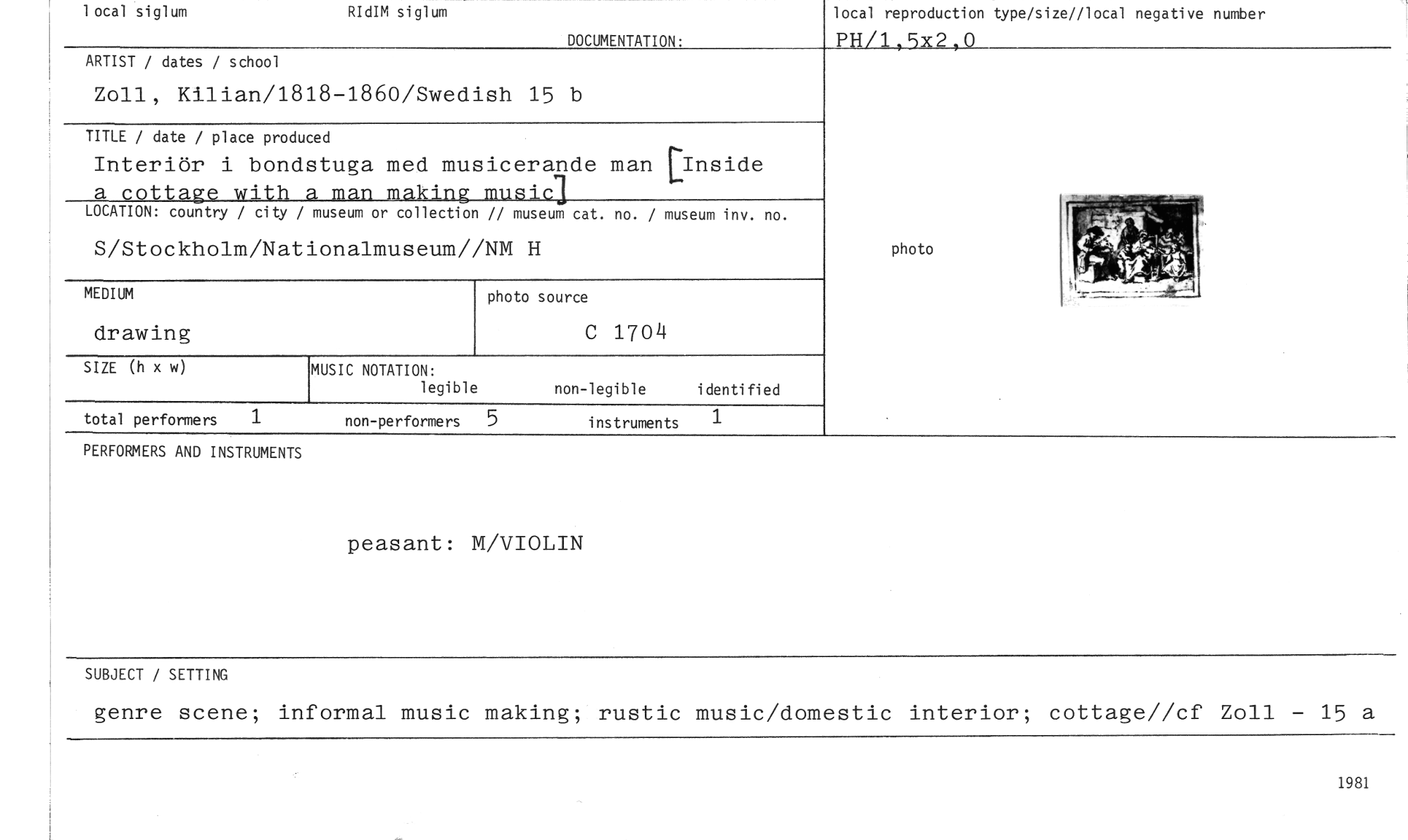 //// local siglum RIdIM siglum //// DOCUMENTATION. //// local reproduction type/size//local negative number //// PH/1,5x2,0 //// ARTIST / dates / school //// Zoll, Kilian/1818-1860/Swedish 15 b //// TITLE / date / place produced //// Interiör i bondstuga med musicerande man [Inside //// a cottage with a man making music] //// LOCATION: country / city / museum or collection // museum cat. no. / museum inv. no. //// S/Stockholm/Nationalmuseum//NM H //// photo //// MEDIUM //// photo source //// C 1704 //// drawing //// SIZE (h x w) //// MUSIC NOTATION: //// legible //// non-legible identified //// 1 //// 1 //// total performers //// non-performers 5 instruments //// PERFORMERS AND INSTRUMENTS //// peasant: M/VIOLIN //// SUBJECT / SETTING //// genre scene; informal music making; rustic music/domestic interior; cottage//cf Zoll - 15 a //// 1981 ////