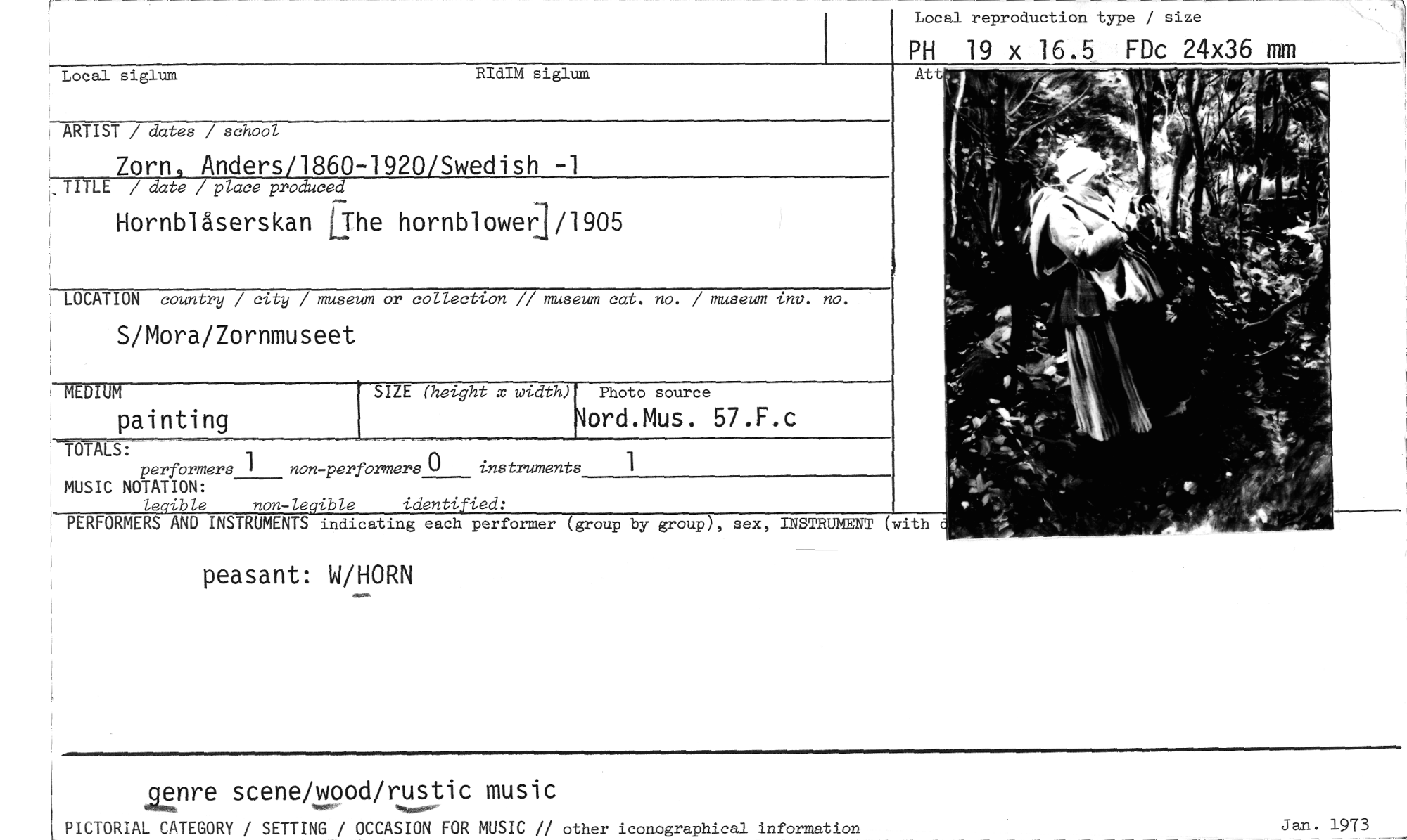 //// MEDIUM //// painting //// SIZE (height x width) //// Photo source //// Vord.Mus. 57.F.c //// (with //// TOTALS: //// performers 1 non-performers 0 instruments //// MUSIC NOTATION: //// legible non-legible identified: //// PERFORMERS AND INSTRUMENTS indicating each performer (group by group), sex, INSTRUMENT //// Local reproduction type / size //// PH 19 x 16.5 FDc 24x36 mm //// Local siglum RIdIM siglum //// ARTIST / dates / school //// Zorn, Anders/1860-1920/Swedish -1 //// TITLE / date / place produced //// Hornblåserskan LThe hornblower]/1905 //// LOCATION country / city / museum or collection // museum cat. no. / museum inv. no. //// S/Mora/Zornmuseet //// peasant: W/HORN //// Att //// •1^-; yrt. 011 i • //// • - //// ' t //// 1 //// genre scene/wood/rustic music //// PICTORIAL CATEGORY / SETTING / OCCASION FOR MUSIC // other iconographical information Jan. 1973 ////