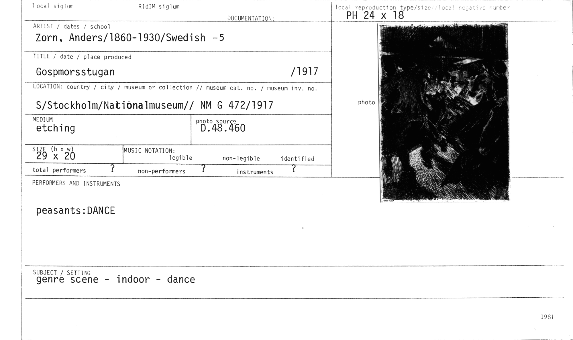 //// total performers //// non-performers instruments //// local siglum RIdIM siglum //// DOCUMENTATION: //// ARTIST / dates / school //// Zorn, Anders/1860-1930/Swedish -5 //// TITLE / date / place produced //// Gospmorsstugan /1917 //// LOCATION: country / city / museum or collection // museum cat. no. / museum inv. no. //// S/Stockholm/Natiönalmuseum// NM G 472/1917 //// phoDto soune .48.460 //// MUSIC NOTATION: //// legible non-legible identified //// PERFORMERS AND INSTRUMENTS //// peasants:DANCE //// MEDIUM //// etching //// sä (r)1( x26 //// photo //// local reproduction type/sizellocal nezative number //// PH 24 x 18 //// SUBJECT / SETTING //// genre scene - indoor - dance //// 1981 ////