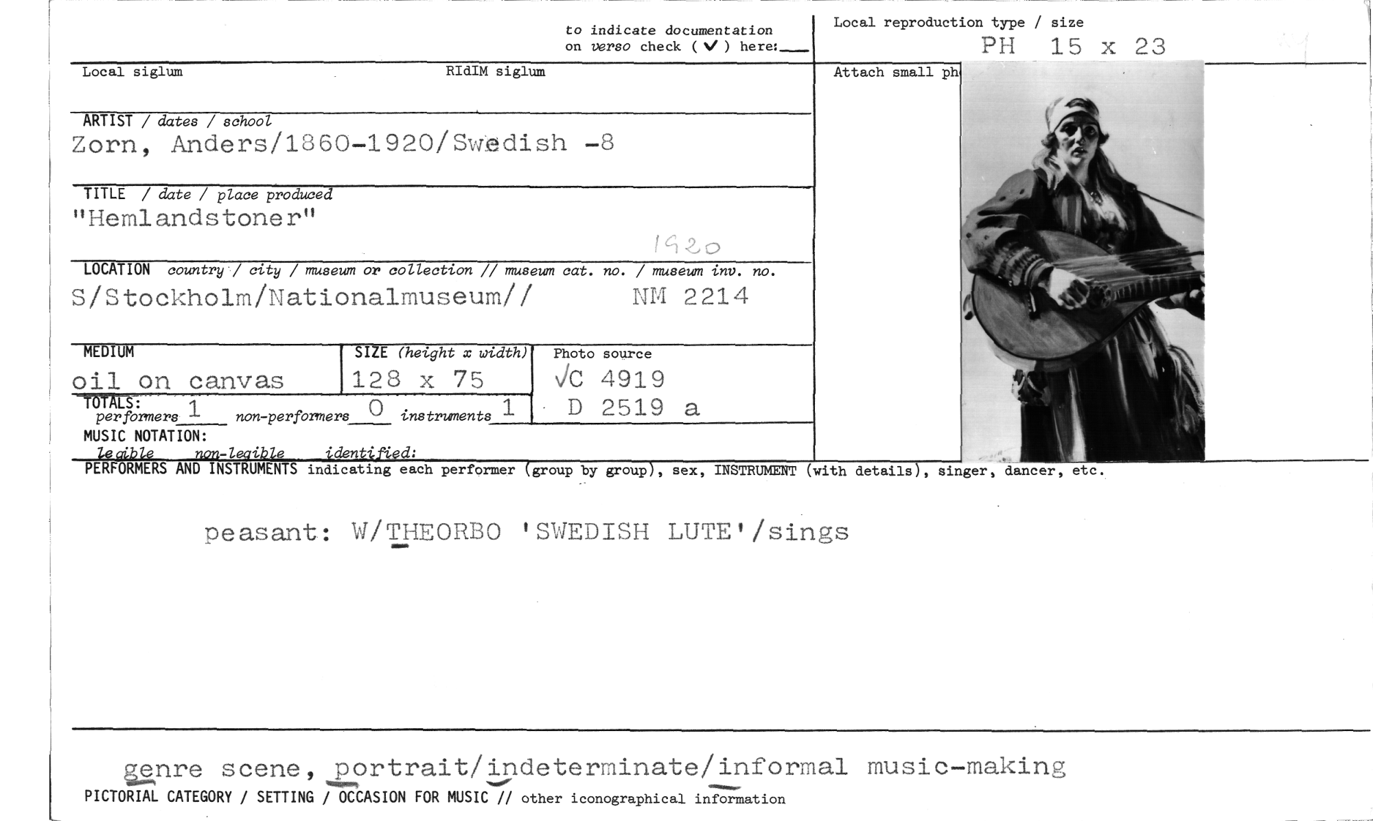 //// to indicate documentation //// on verso check (V ) here:_ //// Local siglum RIdIM siglum //// ARTIST / dates / school //// Zorn, Anders/1860-1920/Swedish -8 //// TITLE / date / place produced //// "Hemlandstoner" //// LOCATION country / city / museum or collection // museum cat. no. / museum inv. no. //// S/Stockholm/Nationalmuseum// NM 2214 //// MEDIUM //// 128 x 75 //// Local reproduction type / size //// Pil 15 x 23 //// oil on canvas //// TOTALS: //// per formers 1- non-performers 0 instruments //// MUSIC NOTATION: //// lecible non-leaible identified: //// SIZE (height x width) //// Photo source //// Jc 4919 //// D 2519 a //// Attach small ph //// PERFORMERS AND INSTRUMENTS indicating each performer (group by group), sex, INSTRUMENT (with details), singer, dancer, etc. //// oeasant: W/THEORBO 'SWEDISH LUTE'/sings //// wire scene, portrait/indeterminate/informal music-making //// PICTORIAL CATEGORY / SETTING / OCCASION FOR MUSIC // other iconographical information ////