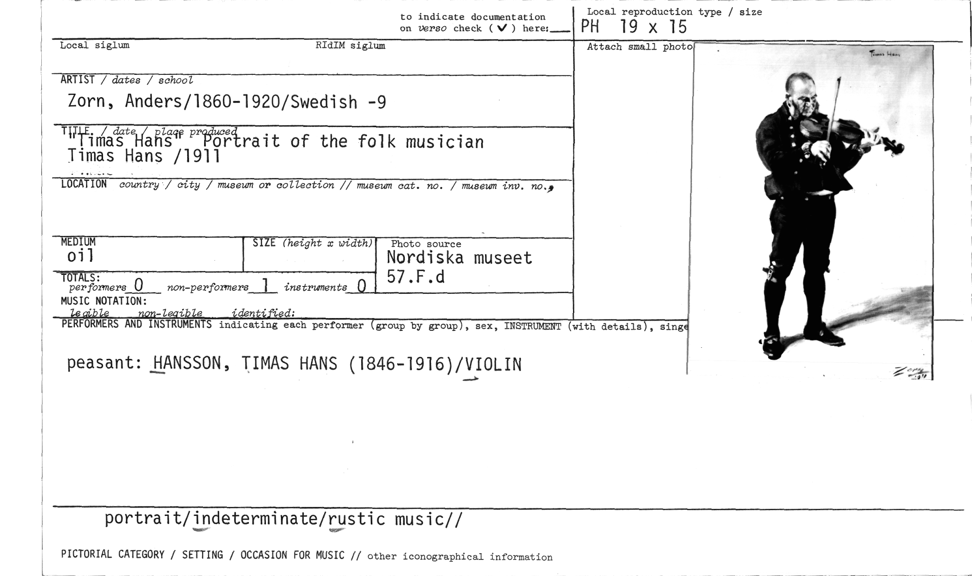 //// portrait/indeterminate/rustic music// //// PICTORIAL CATEGORY / SETTING / OCCASION FOR MUSIC // other iconographical information //// to indicate documentation //// on verso check (V ) here:- //// Local reproduction type / size //// PH 19 x 15 //// siglum RIdIM siglum //// ARTIST / dates / school. //// Zorn, Anders/1860-1920/Swedish -9 //// WIE / date. blaw praduced //// Limas Hans Portrait of the folk musician //// Timas Hans /1911 //// LOCATION country / city / museum or collection // museum cat. no. / museum inv. //// SIZE (height x width) //// -TrALS: //// per formers 0 non-performers 1 instruments 0 //// Photo source //// Nordiska museet 57.F.d //// MEDIUM //// oil //// MUSIC NOTATION: //// Zeoible non-leaible identijkd: //// PERFORMERS AND INSTRUMENTS indicating each performer (group by group), sex, INSTRUMENT //// peasant: HANSSON, TIMAS HANS (1846-1916)/VIOLIN //// (with details), sing //// small photo ////