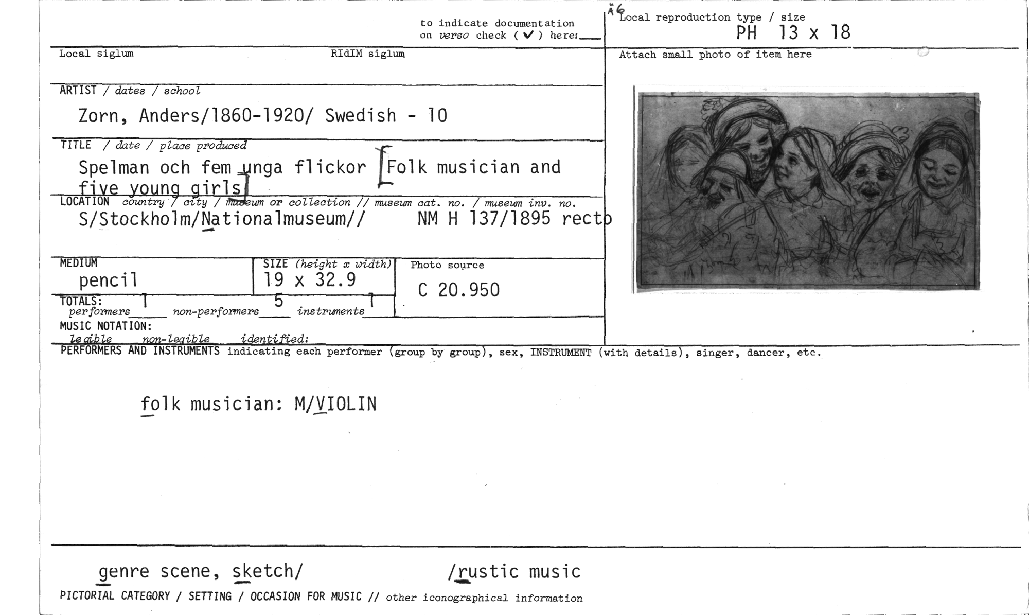 //// tocal reproduction type / size //// to indicate documentation //// on versa check ( %I ) here: _.--- //// PH 13 x 18 //// Local siglum RIdIM siglum //// Attach small photo of item here //// ARTIST / dates / school //// Zorn, Anders/1860-1920/ Swedish - 10 //// TITLE / date / place produced //// Spelman och fem nga flickor Folk musician and five young girls //// LOCATION country city / um or collection // museum cat. no. / museum inv. no. //// S/Stockholm/Nationalmuseum// NM H 137/1895 rect //// SIZE (height x width) //// 19 x 32.9 //// TOTALS: //// per formers //// MUSIC NOTATION: le alble non-leaible identi.fted: PERFORMERS AND INSTRUMENTS indicating each performer (group by group), sex, INSTRUMENT (with details), singer, dancer, etc. //// folk musician: M/VIOLIN //// genre scene, sketch/ /rustic music //// PICTORIAL CATEGORY / SETTING / OCCASION FOR MUSIC // other iconographical information //// MEDIUM //// pencil //// non-performers 5 instruments] //// Photo source //// C 20.950 ////