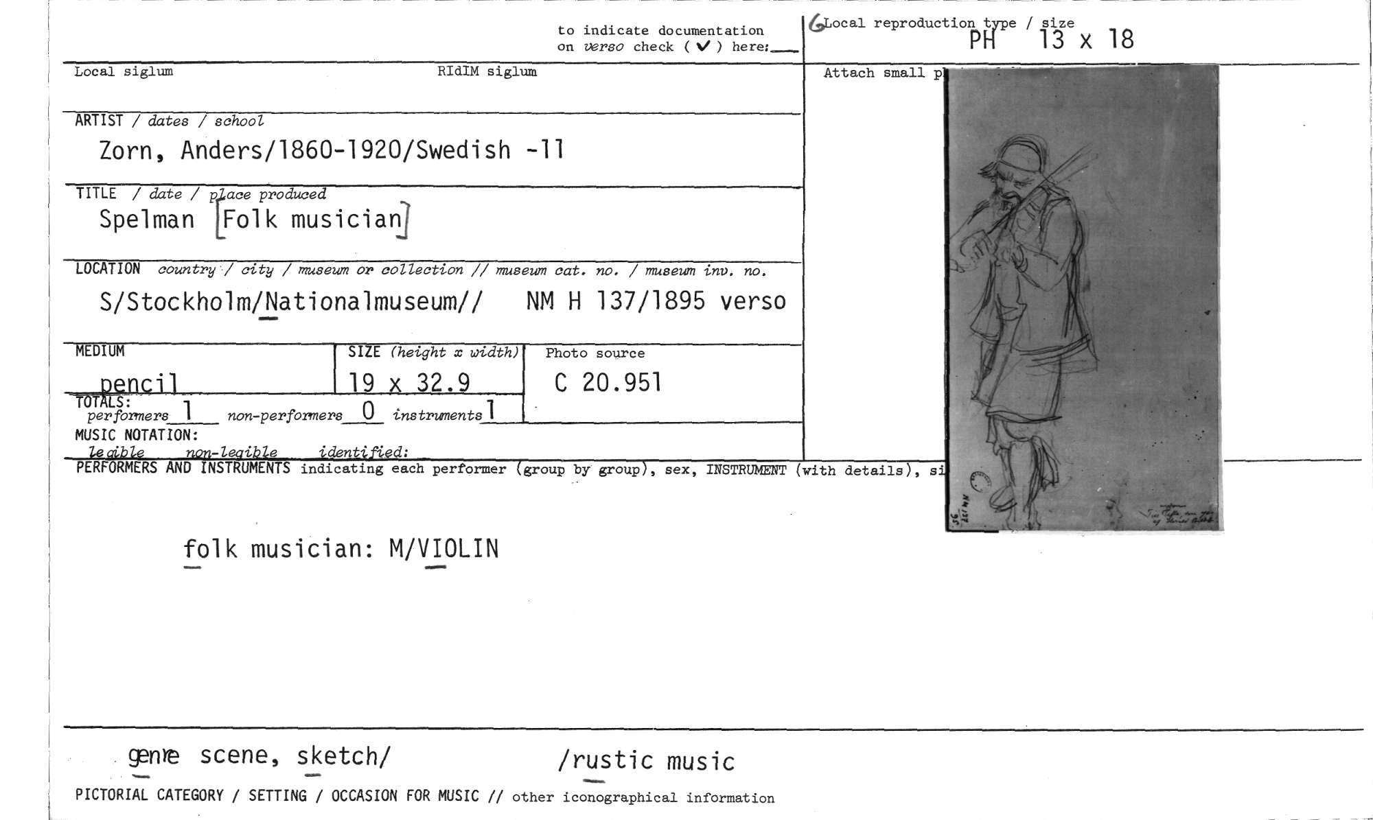 //// on Vers,' check ( ) here: //// 6Local reproduction Kpe / size //// to indicate documentation P 13 x 18 //// Local siglum RIdIM siglum //// ARTIST / dates / school //// Zorn, Anders/1860-1920/Swedish -11 //// TITLE / date / p ace produced //// Spelman Folk musician] //// LOCATION country / city / museum or collection // museum cat. no. / museum .tnv, no. //// S/Stockholm/Nationalmuseum// NM H 137/1895 verso //// ttach small p //// MEDIUM //// TOuncil //// TALS: //// per formers //// SIZE (height x width) //// 19 x 32.9 //// non-performers 0 instruments] //// MUSIC NOTATION: //// non-leaible identified: //// PERFORMERS AND INSTRUMENTS indicating each pertormer (group //// by group), sex, INSTRUMENT (with details), s //// folk musician: M/VIOLIN //// Photo source //// C 20.951 //// genre scene, sketch/ /rustic music //// PICTORIAL CATEGORY / SETTING / OCCASION FOR MUSIC // other iconographical information ////