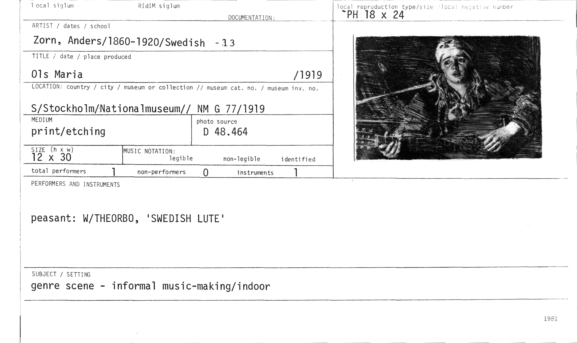 //// 1981 //// MUSIC NOTATION: //// legible //// non-legible identified //// 1 //// 1 //// instruments //// non-performers //// total performers //// 1 ocal siglum RIdIM siglum //// DOCUMENTATION: //// lodal reproduction type/size local necradve nurober //// 'PH 18 x 24 //// ARTIST / dates / school //// Zorn, Anders/1860-1920/Swedish -13 //// TITLE / date / place produced //// Ols Maria /1919 //// LOCAT ON: country / city / museum or collection // museum cat. no. / museum inv. no. //// S/Stockholm/Nationalmuseum// NM G 77/1919 //// MEDIUM //// print/etching //// SIZE (h x w) //// 12 x 30 //// photo source //// D 48.464 //// PERFORMERS AND INSTRUMENTS //// peasant: W/THEORBO, 'SWEDISH LUTE' //// SUBJECT / SETTING //// genre scene - informal music-making/indoor ////