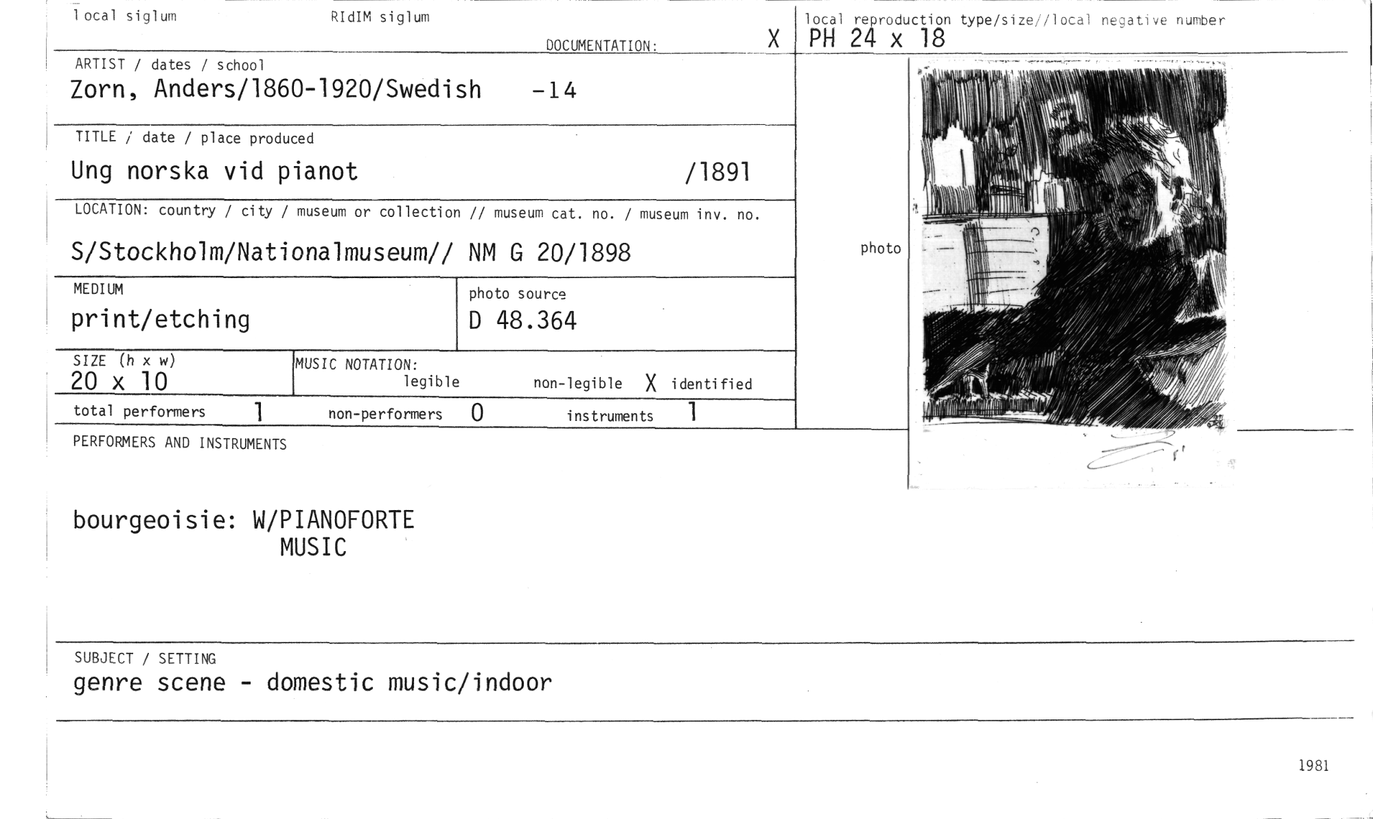 //// 1981 //// 0-1920/Swedish —14 //// ARTIST / dates / school //// Zorn, Anders/186 //// /1891 //// TITLE / date / place produced //// Ung norska vid pianot //// museum or collection // museum cat. no. / museum inv. no. //// LOCATION: country / city / //// onalmuseum// NM G 20/1898 //// S/Stockholm/Nati //// total performers //// 1 non-performers 0 //// 1 ocal siglum RIdIM siglum //// DOCUMENTATION: //// local reproduction type/size//local negative number //// X PH 24 x 18 //// photo source //// D 48.364 //// SIZE (h x w) //// 20 x 10 //// PERFORMERS AND INSTRUMENTS //// bourgeoisie: W/PIANOFORTE //// MUSIC //// MEDIUM //// print/etching //// MUSIC NOTATION: //// legible non-legible X identified //// instruments 1 //// photo //// SUBJECT / SETTING //// genre scene - domestic music/indoor ////