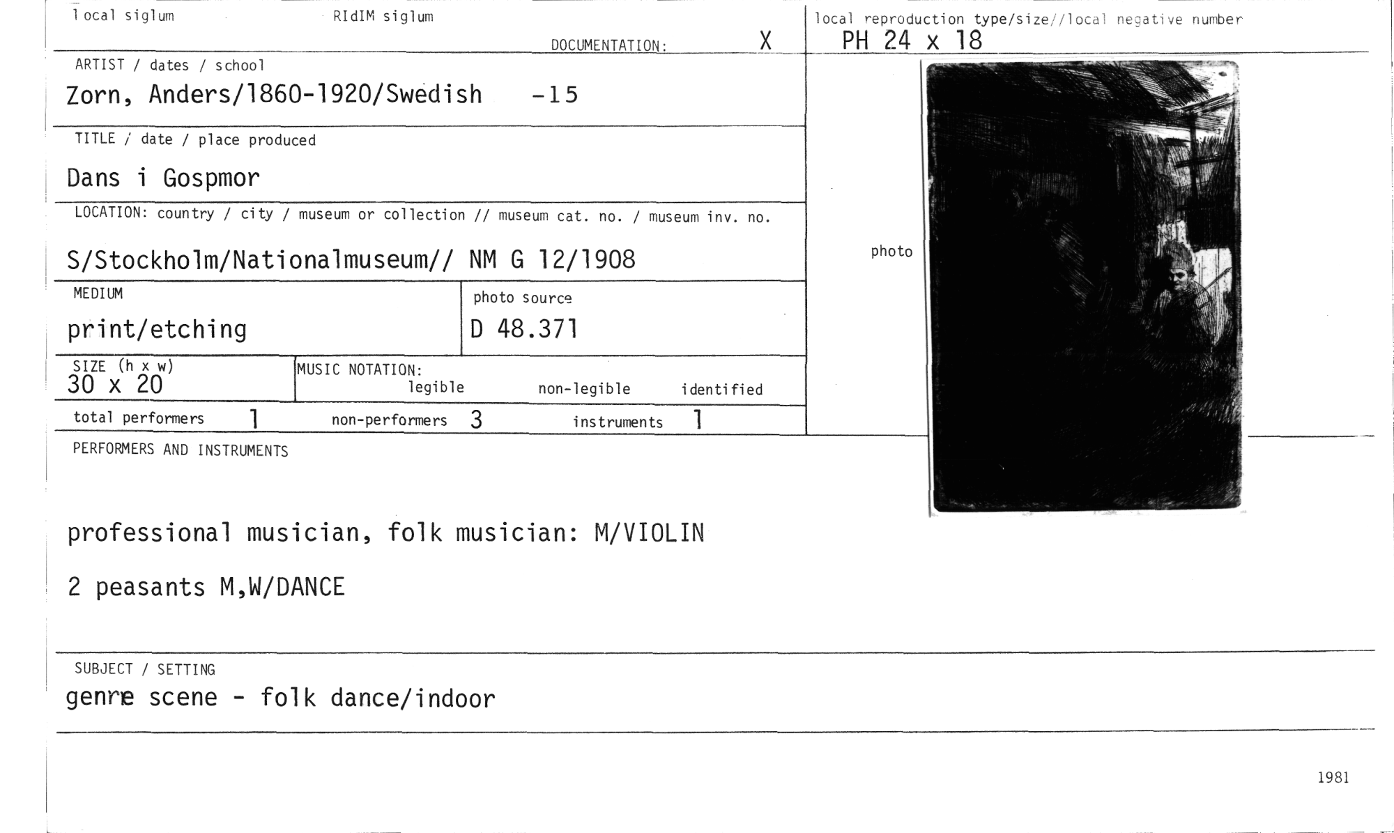 //// 1 otal siglum RIdIM siglum //// DOCUMENTATION: //// ARTIST / dates / school //// Zorn, Anders/1860-1920/Swedish -15 //// local reproduction type/size; oda: negative number //// PH 24 x 18 //// photo //// TITLE / date / place produ ced //// Dans i Gospmor //// LOCATION: country / city / //// S/Stockholm/Nati //// MEDIUM //// print/etching //// SIZE (h x w) //// 30 x 20 //// total performers 1 //// PERFORMERS AND INSTRUMENTS //// non-performers 3 instruments 1 //// photo source //// D 48.371 //// museum or collection // museum cat. no. / museum inv. no. //// onalmuseum// NM G 12/1908 //// MUSIC NOTATION: //// legible non-legible identified //// professional musician, folk musician: M/VIOLIN 2 peasants M,W/DANCE //// SUBJECT / SETTING //// genre scene - folk dance/indoor //// 1981 ////