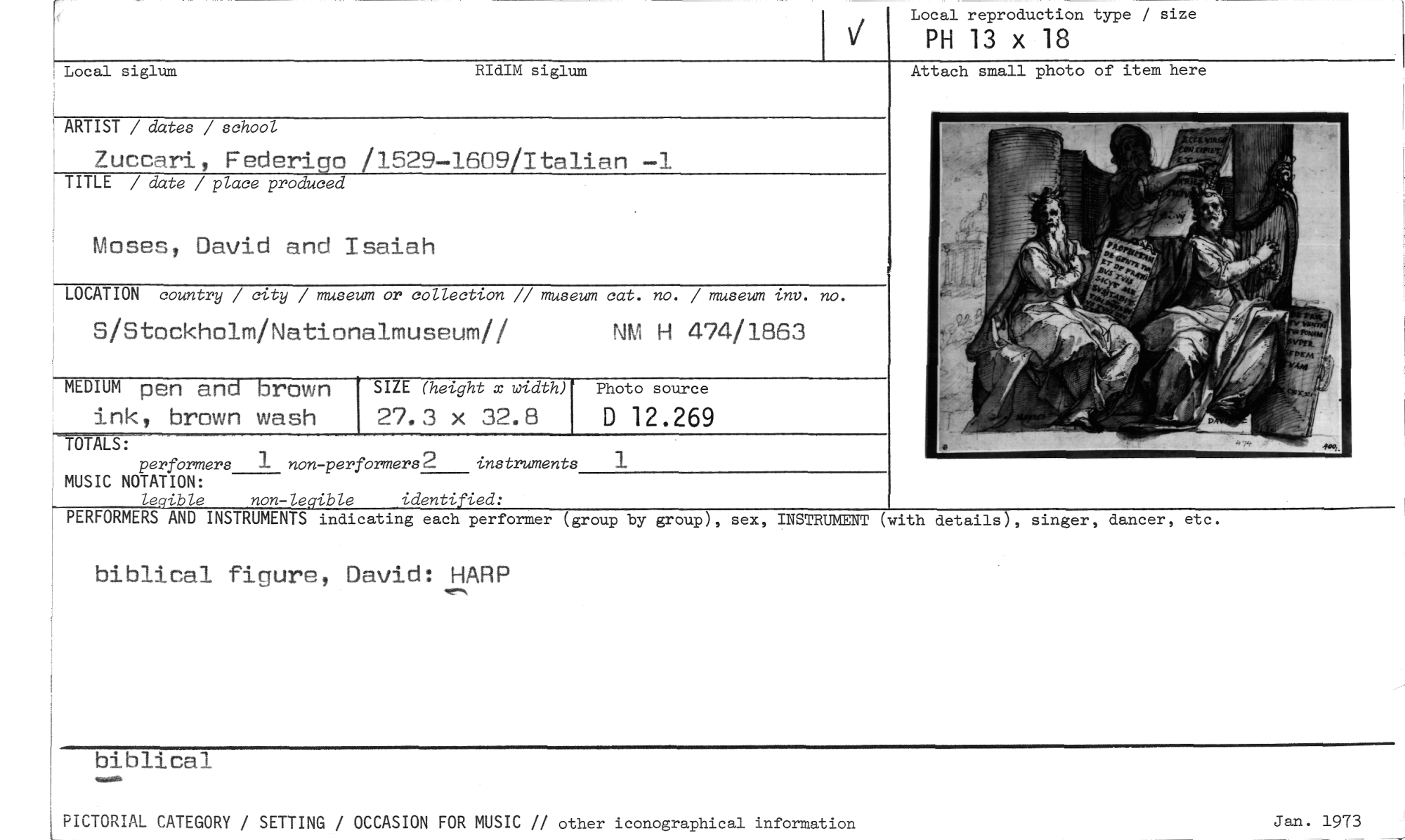 //// Local reproduction type / size //// PH 13 x 18 //// Local siglum RIdIM siglum //// ARTIST / dates / school //// Zucceri, Federica /1529-1609/Italian —1 //// TITLE / date / place produced //// Moses, David and Isaiah //// LOCATION country / city / museum or collection // museum cat. no. / museum inv. no. //// S/Stockholm/Nationalmuseum// NM H 474/1863 //// Photo source //// TOTALS: //// performers 1 non-performers 2 instruments //// MUSIC NOTATION: //// legible non-legible identified: //// PERFORMERS AND INSTRUMENTS indicating each performer (group by group), sex, INSTRUMENT (with //// biblical figure, David: HARP //// MEDIUM pen and brown //// ink, brown wash //// SIZE (height x width) //// 27,3 x 32,8 //// D 12.269 1 //// Attach small photo of item here //// details), singer, dancer, etc. //// biblical //// PICTORIAL CATEGORY / SETTING / OCCASION FOR MUSIC // other iconographical information //// Jan. 1973 ////