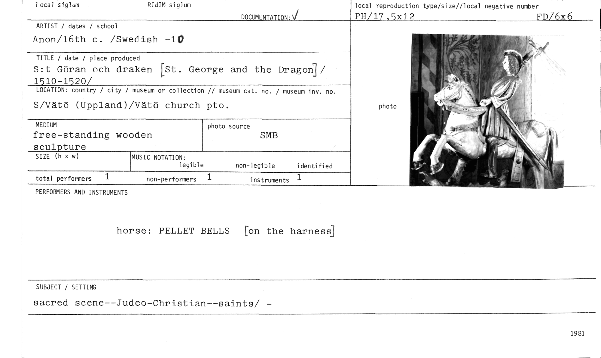 //// 1 ocal siglum //// RIdIM siglum //// DOCUMENTATION4 //// local reproduction type/size//local negative number PH/17,5x12 FD/6x6 //// ARTIST / dates / school //// Anon/16th c. /Swedish -10 //// TITLE / date / place produced //// S:t Göran och draken [St. George and the Dragorg/ //// 1510-1520/ //// LOCATION: country / city / museum or collection // museum ca t. no. / museum inv. no. //// S/Vätö (Uppland)/Vätö church pto. //// photo //// MEDIUM //// free-standing wooden //// photo source //// SMB //// MUSIC NOTATION: //// legible //// non-legible identified //// non-performers 1 instruments 1 //// PERFORMERS AND INSTRUMENTS //// horse: PELLET BELLS [on the harness] //// SUBJECT / SETTING //// sacred scene--Judeo-Christian--saints/ - //// 1981 //// total performers 1 ////