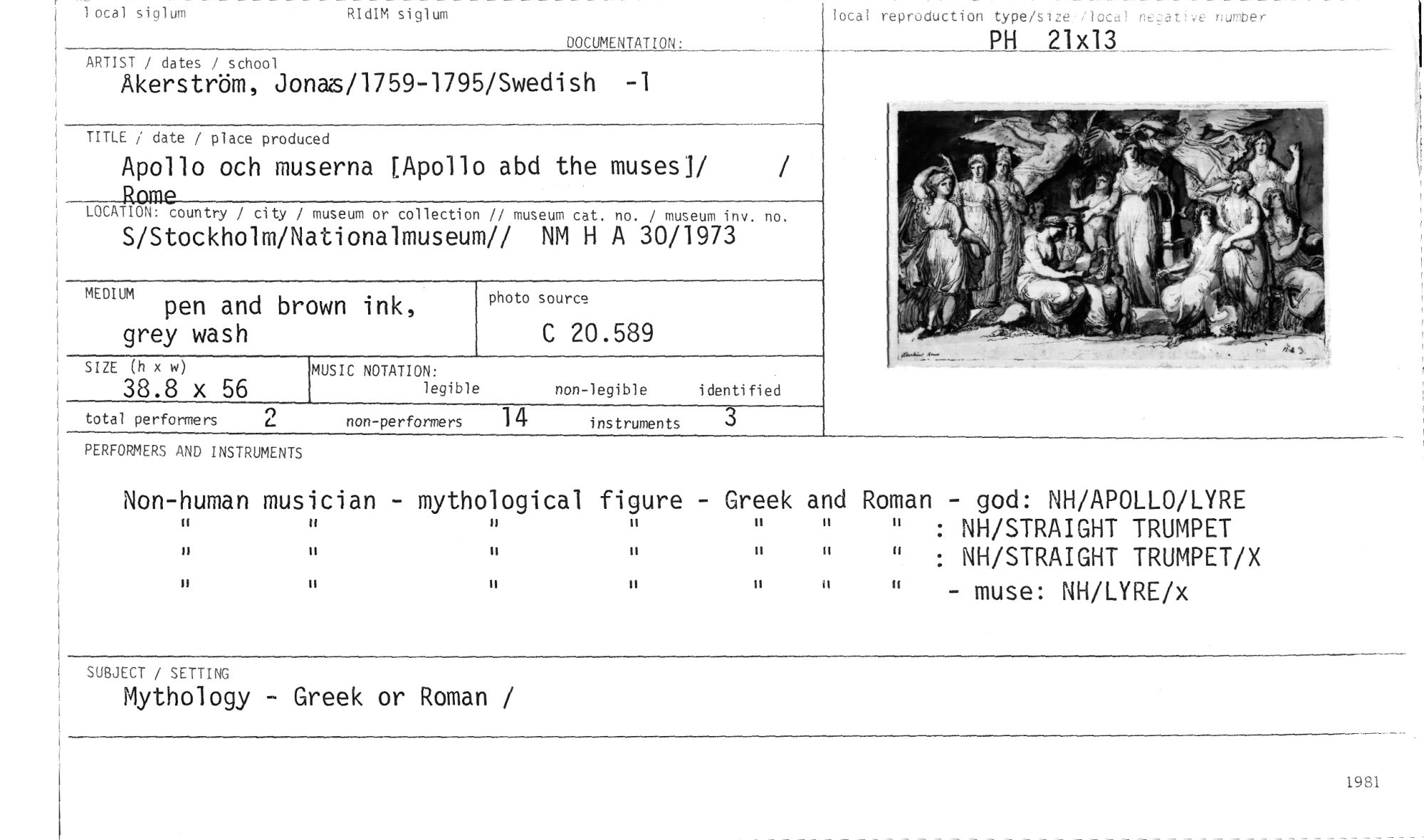 //// lotal siglum RIdIM siglum //// DOCUMENTATION: //// ARTIST / dates / school //// Åkerström, Jonas/1759-1795/Swedish -1 //// lotal reproduction %lotal negative number //// PH 21x13 //// TITLE / date / place produced //// Apollo och muserna [Apollo abd the muses]/ //// Rome //// LOCATION: country / city / //// S/Stockholm/N //// MEDIUM pen and br own ink, grey wash //// SIZE (h x w) //// 38.8 x 56 //// total performers 2 non-performm 14 //// MUSIC NOTATION: //// legible //// non-legiMe identified //// instruments //// 3 //// museum or collection // museum cet. no. / museum inv. no. //// ationalmuseum// NM H A 30/1973 //// photo source //// C 20.589 //// PERFORMERS AND INSTRUMENTS //// Non-human musician mythological figure - Greek and Roman - god: NH/APOLLO/LYRE //// it i, II II Il " : NH/STRAIGHT TRUMPET //// : NH/STRAIGHT TRUMPET/X - muse: NH/LYRE/x //// SUBJECT / SETTING //// Mythology - Greek or Roman / //// 1981 ////