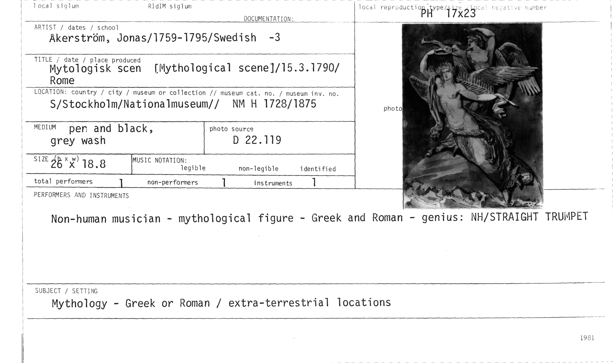 //// Non-human musician - mythological figure - Greek and Roman - genius: NH/STRAIGHT TRUMPET //// total performers //// 1 //// instruments 1 //// RIdIM siglum //// lotal siglum //// DOCUMENTATION: //// ARTIST / dates / school //// Åkerström, Jonas/1759-1795/Swedish -3 //// TITLE / date / place produced //// Mytologisk scen [Mythological scenel/15.3".1790/ Rome //// LOCATION: country / city / museum or collection // museum cat. no. / museum inv. no. //// S/Stockholm/Nationalmuseum// NM H 1728/1875 //// lotal reproductiotsgype/4 XLJ,41.pcal negative number //// I //// photo //// MEDIUM per and black, //// grey wash //// s'Sx'18.8 //// photo source //// D 22.119 //// non-legible i denti fi ed //// legible //// MUSIC NOTATION: //// PERFORMERS AND INSTRUMENTS //// SUBJECT / SETTING //// Mythology - Greek or Roman / extra-terrestrial locations //// 1981 ////