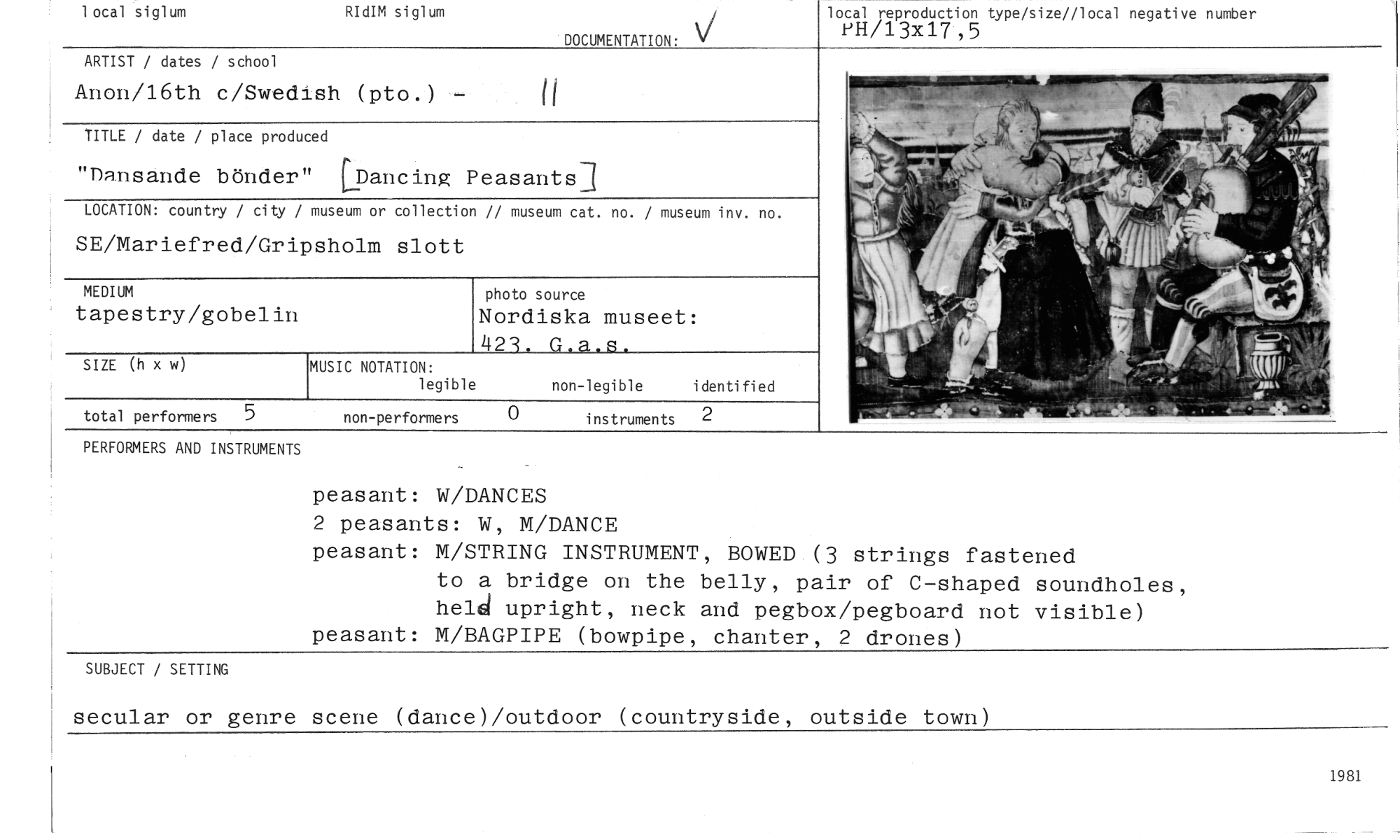 //// PERFORMERS AND INSTRUMENTS //// peasant: W/DANCES //// 2 peasants: W, M/DANCE //// peasant: M/STRING INSTRUMENT, BOWED (3 strings fastened //// to a bridge on the belly, pair of C-shaped soundholes, //// hell upright, neck and pegbox/pegboard not visible) peasant: M/BAGPIPE (bowpipe, chanter, 2 drones) //// SUBJECT / SETTING //// secular or genre scene (dance)/outdoor (countryside, outside town) //// 11 //// ARTIST / dates / school //// Anon/16th c/Swedish (pto.) //// photo source //// Nordiska museet: 423 G a s //// MEDIUM //// tapestry/gobelin //// total performers 5 //// non-performers 0 instruments 2 //// local siglum //// RIdIM siglum //// local reproduction type/size//local negative number //// PH/133E17,5 //// DOCUMENTATION //// TITLE / date / place produced //// "Dansande bönder" bancing Peasants] //// LOCATION: country / city / museum or collection // museum cat. no. / museum inv. no. //// SE/Mariefred/Gripsholm slott //// SIZE (h x w) //// MUSIC NOTATION: //// legible //// non-legible identified //// 1981 ////