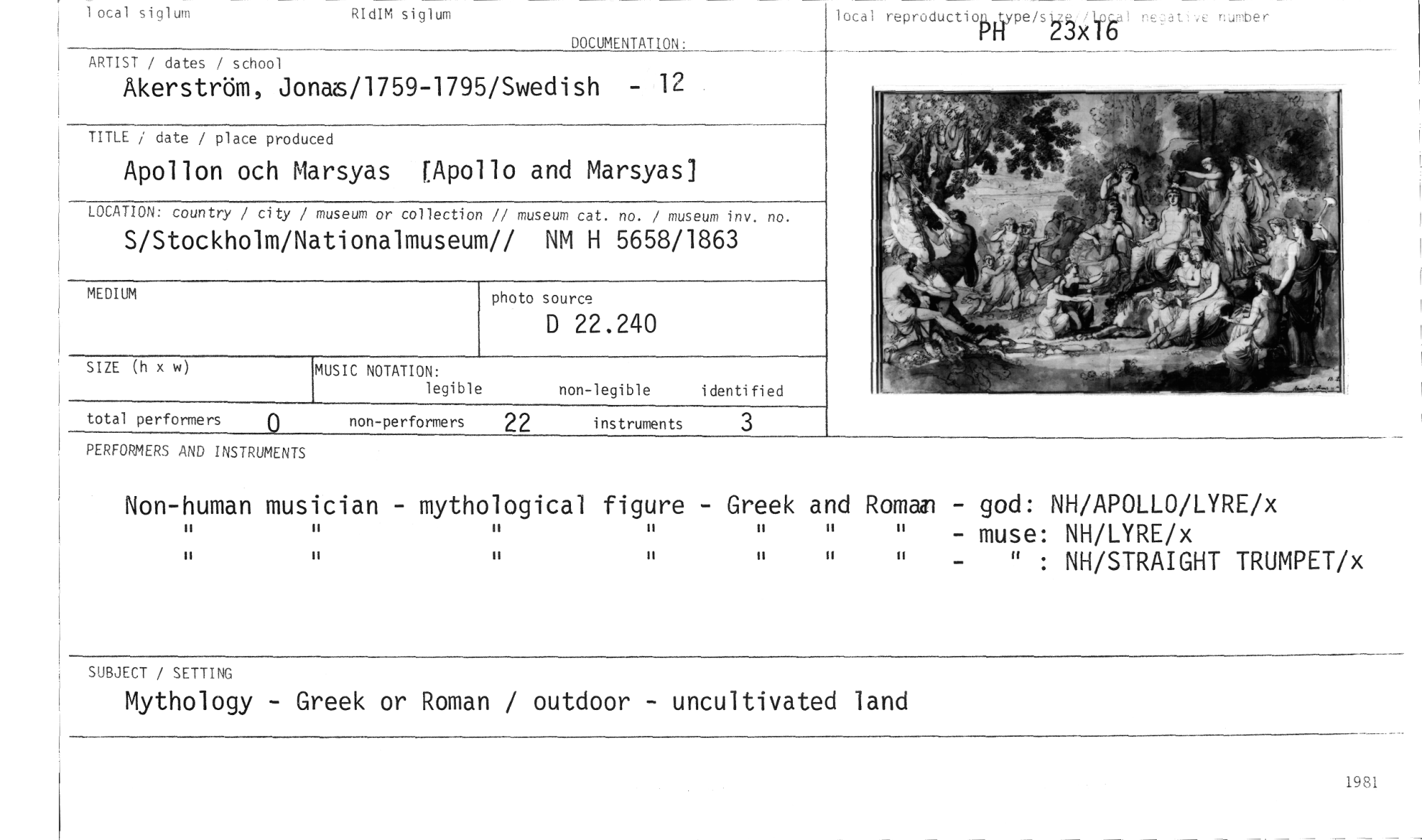 //// local siglum RIdIM siglum //// DOCUMENTATION: //// ARTIST / dates / school //// Åkerström, Jonas/1759-1795/Swedish - 12 //// TITLE / date / place produced //// Apollon och Marsyas [Apollo and Marsyas] //// LOCATION: country / city / museum or collection // museum cat. no. / museum inv. no. //// S/Stockholm/N ationalmuseum// NM H 5658/1863 //// MEDIUM photo source //// D 22.240 //// SIZE (h x w) MUSIC NOTATION: i den ti fi ed //// legible non-legible //// total performers 0 non-parformers 22 instruments 3 //// lotal repre,ductioNyPeis //// 4,3X //// PERFORMERS AND INSTRUMENTS //// Non-human musician - mythological figure - Greek and Roman - god: NH/APOLLO/LYRE/x //// n .1 - muse: NH/LYRE/x //// " : NH/STRAIGHT TRUMPET/x //// SUBJECT / SETTING //// Mythology - Greek or Roman / outdoor - uncultivated land //// 1981 ////