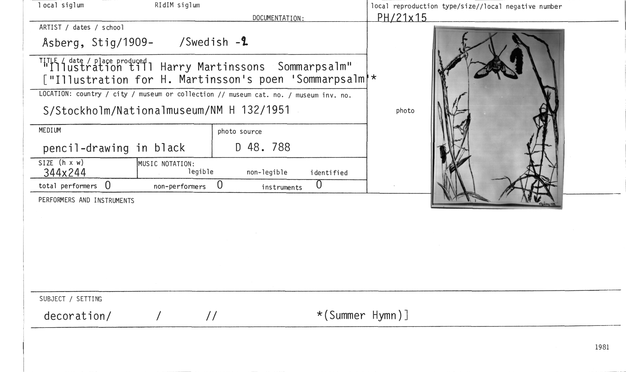 //// 1 ocal siglum RIdIM siglum //// local reproduction type/size//local negative number //// DOCUMENTATION. //// PH/21x15 //// MUSIC NOTATION: //// legible //// non-legible identified //// non-performers 0 instruments //// 0 //// ARTIST / dates / school //// Asberg, Stig/19 //// ["Illustration //// LOCATION: country / city / //// S/Stockholm/Nat //// MEDIUM //// pencil-drawing //// SIZE (h x w) //// 344x244 //// total performers 0 //// PERFORMERS AND INSTRUMENTS //// 09- /Swedish //// Harry Martinssons Sommarpsalm" for H. Martinsson's poen 'Sommarpsalm //// museum or collection // museum cat. no. / museum inv. no. //// ionalmuseum/NM H 132/1951 //// in black //// 1* //// photo //// photo source //// D 48. 788 //// SUBJECT / SETTING //// decoration/ // *(Summer Hymn)] //// 1981 ////