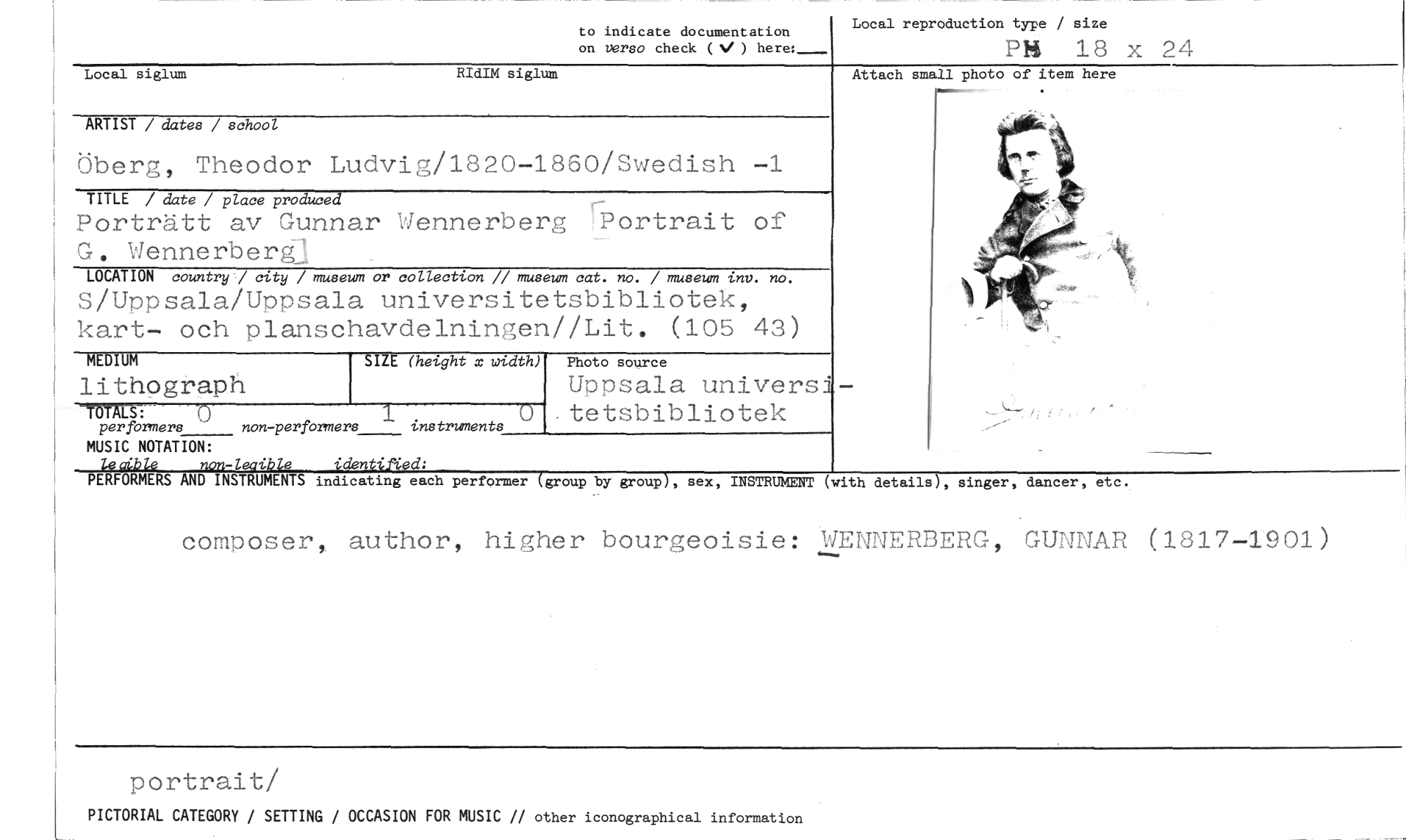 //// to indicate documentation //// on verso check ( ) here:__-- //// Local reproduction type / size //// PM 18 //// oA //// Local siglum RIdIM siglum //// ARTIST / datas / school //// Öberg, Theodor Ludvig/1820-1860/Swedish -1 //// TITLE / date / place produced //// Porträtt av Gunnar Wennerberg Uportrait of G. Wennerbere //// LOCATION country / city / museum or collection // museum cat. no. / museum inc. no. //// S/Uppsala/Uppsala universitetsbibliotek, kart- och planschavdelningen//Lit. (105 43) //// MEDIUM SIZE (height x width) Photo source //// lithograph Uppsala universi //// Turks, 0 1 instruments 0 tetsbibliotek //// per formers non-perfbrmers //// MUSIC NOTATION: //// lecible non-leaible identilYed: //// Attach small photo of item here //// PERFORMERS AND INSTRUMENTS indicating each performer (group by group), sex, INSTRUMENT (with details), singer, dancer, etc. //// composer, author, higher bourgeoisie: WENNERBERG, GUNNAR (1817-1901) //// portrait/ //// PICTORIAL CATEGORY / SETTING / OCCASION FOR MUSIC // other iconographical information ////
