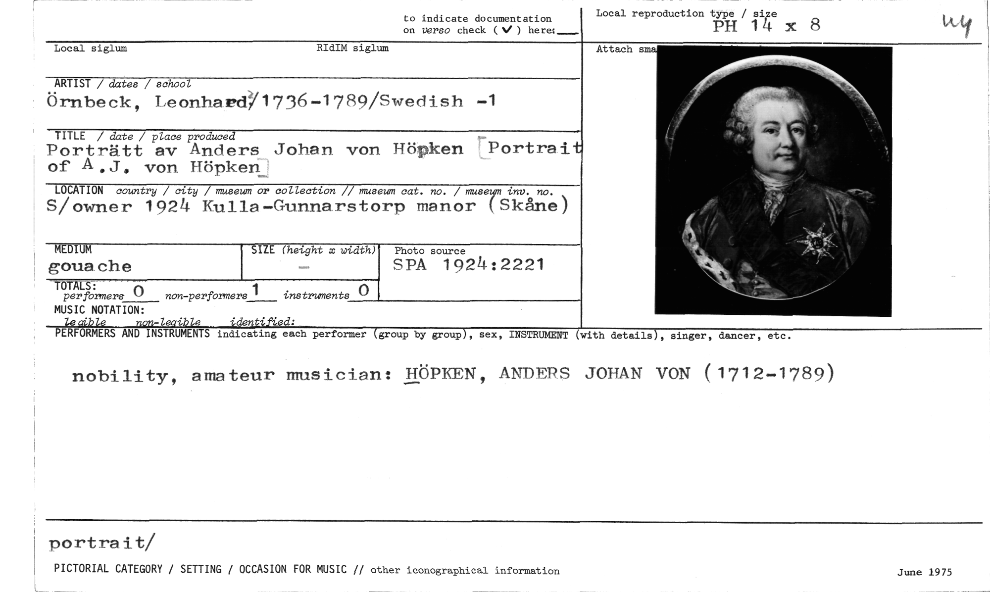 //// nobility, amateur musician: HöPKEN, ANDERS JOHAN VON (1712-1789) //// portrait/ //// PICTORIAL CATEGORY / SETTING / OCCASION FOR MUSIC // other iconographical information June 1975 //// to indicate documentation on verso check ( ) Local reproduction type / size //// PH 14 x 8 //// Local siglum RIdIM siglum //// ARTIST / dates / school //// Örnbeck, Leonhar01736-1789/Swedish -1 //// TITLE / date / place produoed //// Porträtt av Anders Johan von. Hapken Portrait of A.J. von Höpken_ //// LOCATION country / city / museum or collection // museum cat. no. / musetsm inv. no. //// S/owner 1924 Kulla -Gunnarstorp manor (Skåne) //// Attach s //// SIZE (height x width) //// Photo source //// SPA 1924:2221 //// MEDIUM //// gouache //// per formers 0 non-perfbrmers instruments //// MUSIC NOTATION: //// non-lecible identiAed: //// PERFORMERS AND INSTRUMENTS //// (with details), singer, dancer, etc. //// indicating each performer (group by group), sex, INSTRUMENT ////