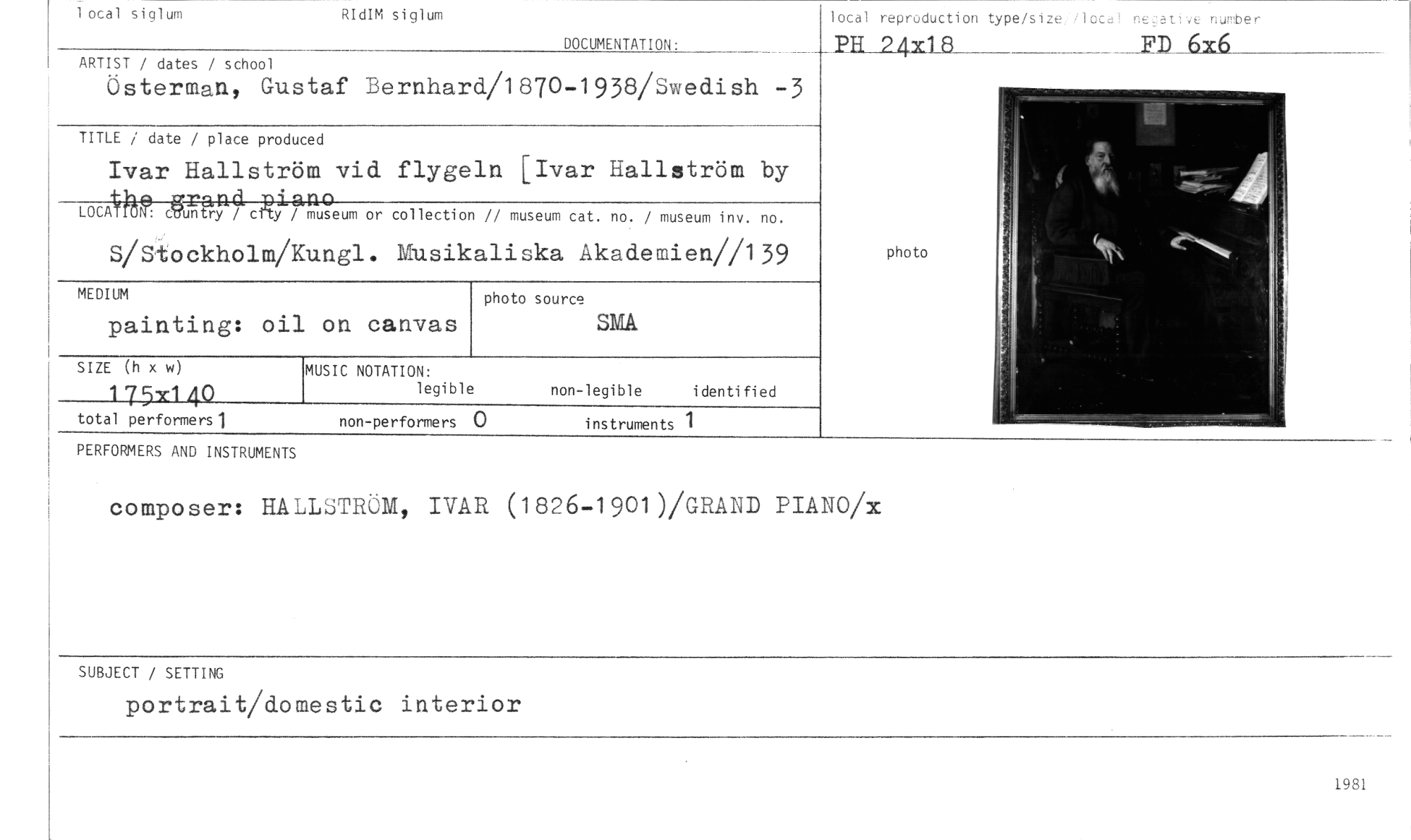 //// 1 ocal siglum //// RId M siglum //// lata] reproduction type/size lotal negative nurober //// _ED 6x6 //// DOCUMENTATION: PR 24Y18 //// ARTIST / dates / school //// Österman, Gustaf Bernhard/1870-1938/Swedish -3 //// TITLE / date / place produced //// Ivar Hallström vid flygeln [Ivar Hallström by //// LOCA Igig151Aenum or collection // museum cat. no. / museum inv. no. //// S/Stockholm/Kungl. Musikaliska Akademien//139 //// MEDIUM //// painting: oil on canvas //// PERFORMERS AND INSTRUMENTS //// composer: HALLSTRÖM, IVAR (1826-1901)/GRAND PIANO/x //// SUBJECT / SETTING //// portrait/domestic interior //// SIZE (h x w) //// 175r140 //// total performers 1 //// MUSIC NOTATION: //// legible non-legible identified //// non-performers 0 instruments 1 //// photo source //// SMÅ //// photo //// 1981 ////