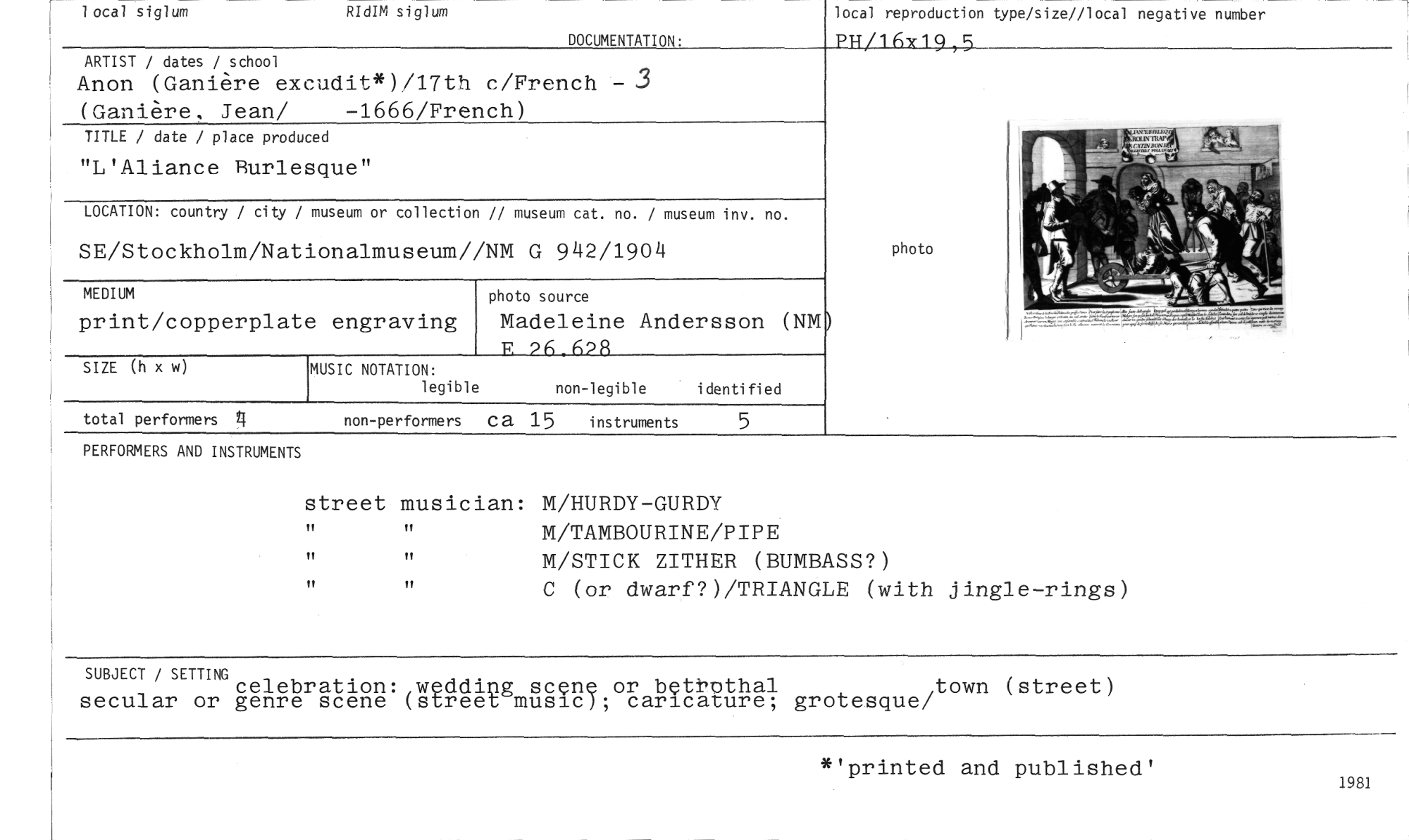//// local siglum RIdIM siglum //// DOCUMENTATION• //// local reproduction type/size//local negative number //// PH/1 hx19 ,5 //// ARTIST / dates / school //// Anon (Ganiere excudit*)/17th c/French -3 (Ganiere, Jean/ -1666/French) //// TITLE / date / place produced //// "L'Aliance Burlesque" //// LOCATION: country / city / museum or collection // museum cat. no. / museum inv. no. //// SE/Stockholm/Nationalmuseum//NM G 942/1904 //// photo source //// Madeleine Andersson (NM) //// 26 h2R //// MEDIUM //// print/copperplate engraving //// photo //// //// SIZE (h x w) //// MUSIC NOTATION: //// legible non-legible i denti fi ed //// total performers non-performers ca 15 instruments 5 //// PERFORMERS AND INSTRUMENTS //// street musician: M/HURDY-GURDY //// ” M/TAMBOURINE/PIPE //// M/STICK ZITHER (BUMBASS?) //// C (or dwarf?)/TRIANGLE (with jingle-rings) //// SUBJECT / SETTING //// celebration: wedding scene or betbothal //// secular or genre scene (street music); caricature; grotesque/ //// (street) //// 4"printed and published' //// 1981 ////