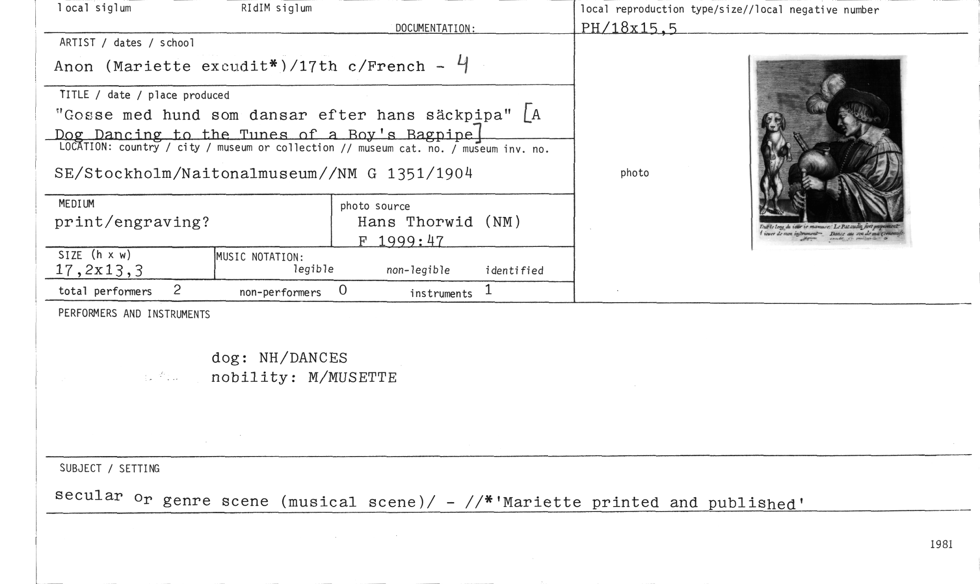 //// local reproduction type/size//local negative number //// PH/18X15,5 //// local siglum RIdIM siglum //// DOCUMENTATION. //// ARTIST / dates / school //// photo //// Anon (Mariette excudit*)/17th c/French - q //// TITLE / date / place produced //// "Gosse med hund som dansar efter hans säckpipa" //// Dng Dancing to the TuneR nf a Boy'R Ragpipel //// LOCATION: country / city / museum or collection // museum cat. no. / museum inv. no. //// SE/Stockholm/Naitonalmuseum//NM G 1351/1904 //// photo source //// Hans Thorwid (NM) //// F 1999:47 //// MEDIUM //// print/engraving? //// MUSIC NOTATION: //// legible //// non-legible identified //// SIZE (h x w) 17,2x13,3 //// total performers 2 non-performers 0 instruments 1 //// PERFORMERS AND INSTRUMENTS //// dog: NH/DANCES nobility: M/MUSETTE //// SUBJECT / SETTING //// secular or genre scene (musical scene)/ - //*'Mariette printed and published' //// 1981 ////