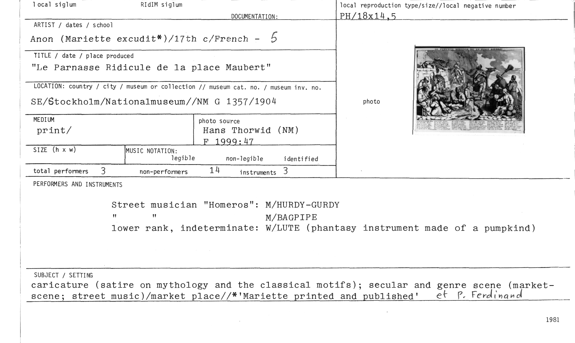 //// 1 ocal siglum RIdIM siglum //// DOCUMENTATION: //// local reproduction type/size//local negative number //// PH/18x14,5 //// ARTIST / dates / school //// Anon (Mariette excudit*)/17th c/French — //// TITLE / date / place produced //// "Le Parnasse Ridicule de la place Maubert" //// LOCATION: country / city / museum or collection // museum cat. no. / museum inv. no. //// SE/Stockholm/Nationalmuseum//NM G 1357/1904 //// MEDIUM //// print/ //// SIZE (h x w) //// total performers 3 non-performers 14 instruments 3 //// MUSIC NOTATION: //// legible non-legible identified //// photo source //// Hans Thorwid (NM) F 1999:47 //// photo //// PERFORMERS AND INSTRUMENTS //// Street musician "Homeros": M/HURDY-GURDY //// H M/BAGPIPE //// lower rank, indeterminate: W/LUTE (phantasy instrument made of a pumpkind) //// SUBJECT / SETTING //// caricature (satire on mythology and the classical motifs); secular and genre scene (marketscene; street music)/market place//*'Mariette printed and published' et r. Fer.G.1.2.d //// 1981 ////