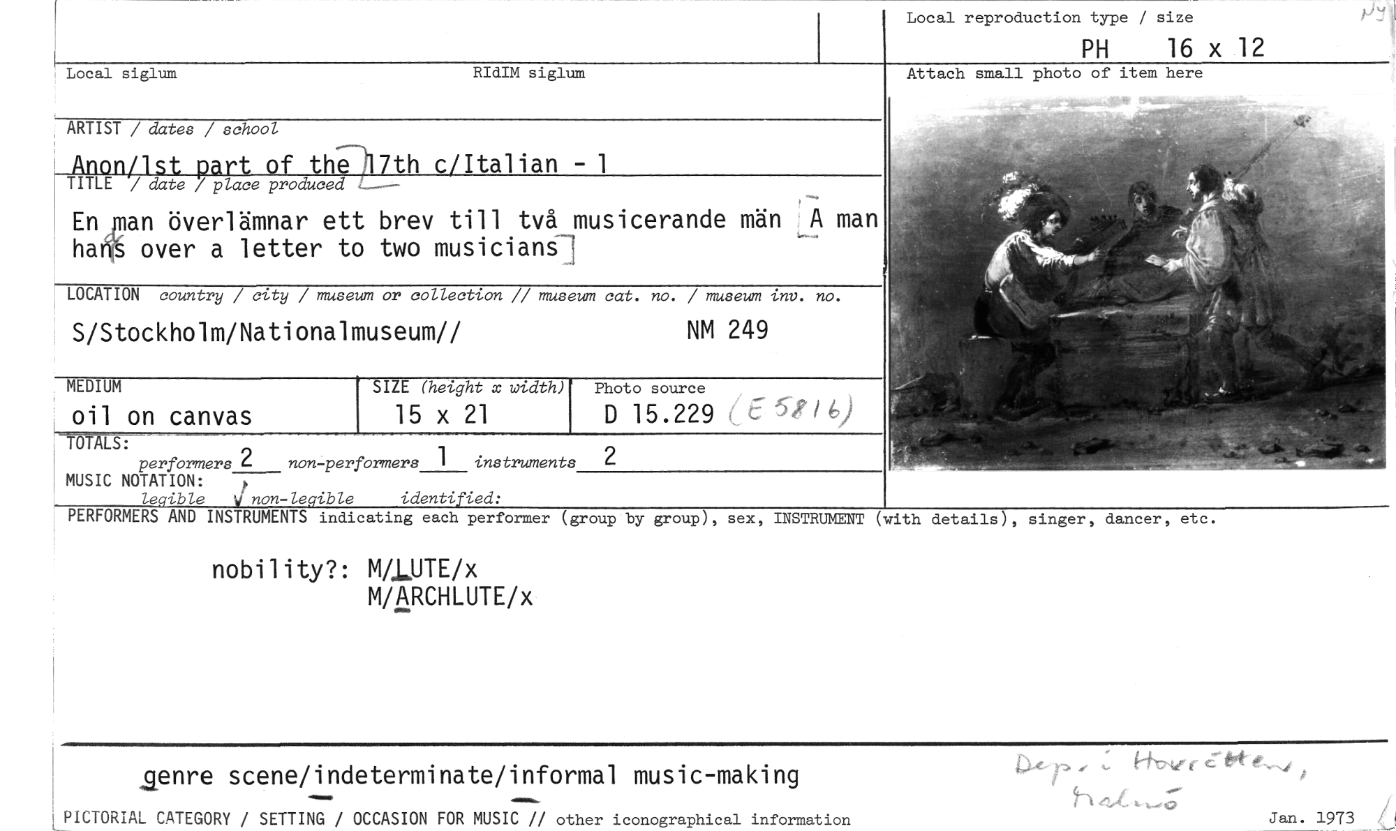 //// Local reproduction type / size //// PH 16 x 12 //// Local siglum RIdIM siglum Attach small photo of item here //// ARTIST / dates / school //// Annn/lst part of theOth c/Italian - 1 //// TITLE / date / place produced .L.-- 1.'-; A //// ^ - //// Enan överlämnar ett brev till två musicerande män A man //// hargover a letter to two musiciansi //// LOCATION country / city / museum or collection // museum cat. no. / museum inv. no. — //// S/Stockholm/Nationalmuseum// NM 249 //// MEDIUM SIZE (height x width) Photo source //// 0 il on canvas 15 x 21 D 15.229 E 5,i69 //// TOTALS: .. .. ..« //// performers 2 non-performers 1 instruments 2 //// MUSIC NOTATION: ?, //// legible v non-legible identified: //// PERFORMERS AND INSTRUMENTS indicating each performer (group by group), sex, INSTRUMENT (with details), singer, dancer, etc. //// nobility?: M4LUTE/x //// M/ARCHLUTE/x //// .genre scene/indeterminate/informal music-making Jan. 1973_ //// ^••••^ ^•••110. //// PICTORIAL CATEGORY / SETTING / OCCASION FOR MUSIC // other iconographical information ////