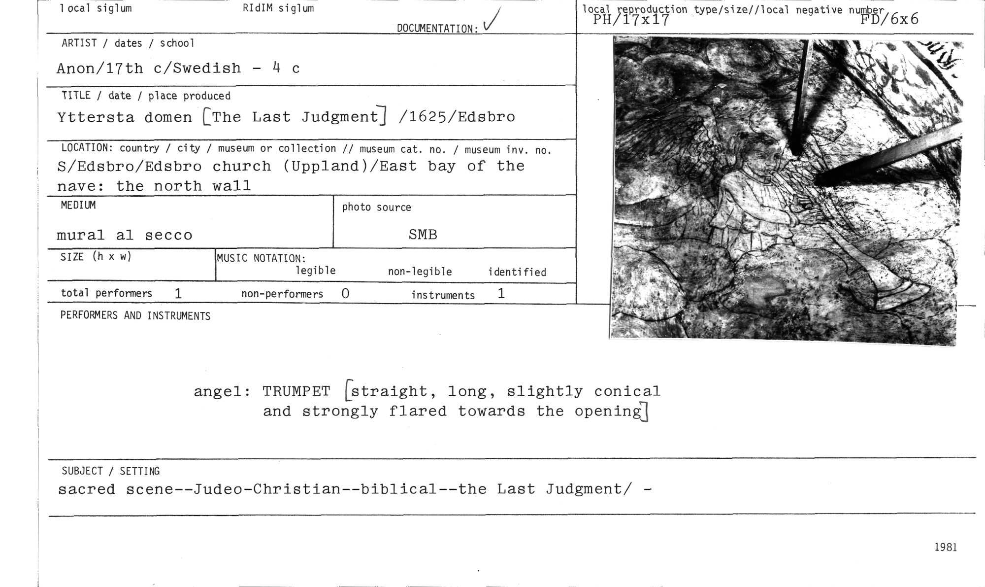 //// 1981 //// RIdIM siglum //// local siglum //// DOCUMENTATION: //// local reproduction type/size//local negative number PH/17X17 FD/6X6 //// total performers 1 //// non-performers 0 instruments 1 //// ARTIST / dates / school //// Anon/17th c/Swedish — 4 c //// TITLE / date / place produced //// Yttersta domen [The Last Judgmen.6] /1625/Edsbro //// LOCATION: country / city / museum or collection // museum cat. no. / museum inv. no. //// S/Edsbro/Edsbro church (Uppland)/East bay of the nave: the north wall //// PERFORMERS AND INSTRUMENTS //// SIZE (h x w) //// MUSIC NOTATION: //// legible //// non-legible identified //// MEDIUM //// mural al secco //// photo source //// SMB //// angel: TRUMPET [straight, long, slightly conical and strongly flared towards the opening] //// SUBJECT / SETTING //// sacred scene--Judeo—Christian--biblical--the Last Judgment/ — ////