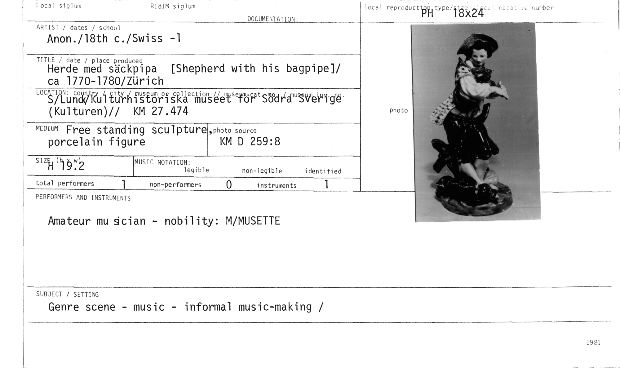 //// 1981 //// instruments 1 //// total performers 1 non-performers //// ARTIST / dates / school //// Anon./18th c./Swiss -1 //// TITLE / date / place produced //// Herde med säckpipa [Shepherd with his bagpipe]/ ca 1770-1780/ZUrich //// LOCATION: countrv L ity J mus um r c Ilection nuse.n. t e. u . . //// S/Lunä/Kuiturhistorloska museet toP Sbar4d"Wefigb (Kulturen)// KM 27.474 //// PERFORMERS AND INSTRUMENTS //// Amateur mu sician - nobility: M/MUSETTE //// ocal reproducdo //// type/ ifficMcaJ ne:ative nurober //// SUBJECT / SETTING //// Genre scene - music - informal music-making / //// iocal siglum RIdIM siglum //// DOCUMENTATION: //// MEDIUM Free standing sculpture porcelain figure //// ,photo source //// KM D 259:8 //// sizyl() §wä //// MUSIC NOTATION: //// legible //// non-legible identified ////
