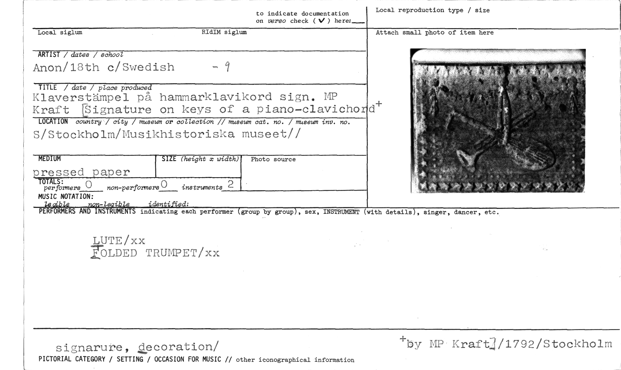 //// to indicate documentation //// on versa check (V ) here:_ //// Local reproduction type / size //// Local siglum RIdIM siglum //// Attach small photo of item here //// d+ //// ARTIST / dates / school //// Anon/18th c/Swedish //// TITLE / date / place produced //// Klaverstämpel på hammarklavikord sign. MP Kraft Dignature on keys of a piano-clavichor //// LOCATION country / city / museum or collection // museum cat. no. / museum inv. no. //// S/Stockholm/Musikhistoriska museet// //// Photo source //// Itrssedpaper //// IDTALS: //// per formers 0 non-performers0 instruments //// MUSIC NOTATION: //// le ble non-leaible //// PERFORMERS AND INSTRUMENTS indicating each performer (group by group), sex, INSTRUMENT (with details), singer, dancer, etc. //// LUTE/xx //// rOLDED TRUMPET/xx //// MEDIUM SIZE (height x width) //// signarure, decoration/ //// PICTORIAL CATEGORY / SETTING / OCCASION FOR MUSIC // other iconographical information //// +by MP Kraft/1792/Stockholm ////