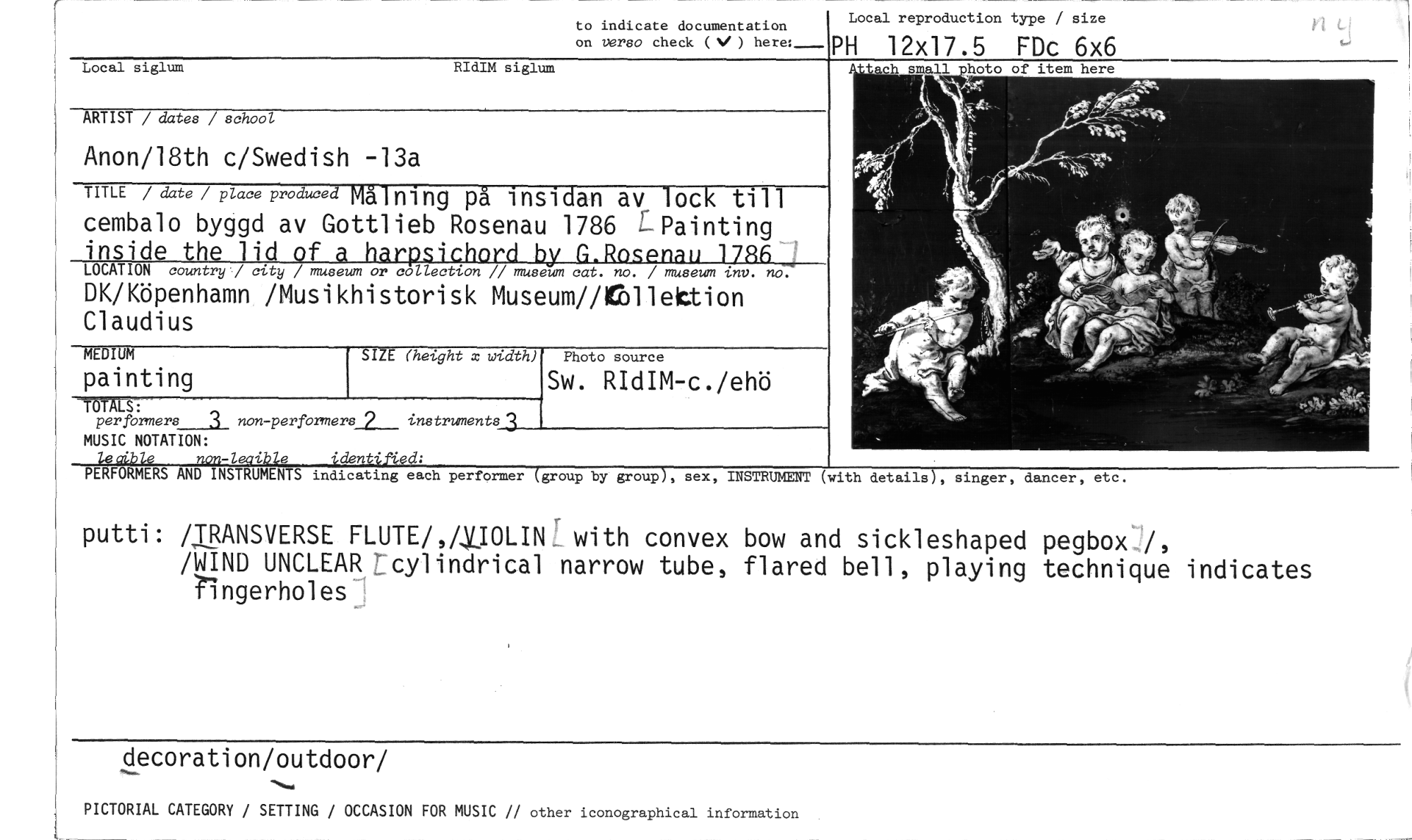 //// to indicate documentation //// on verso check ( ) here:_ //// PH 12x17.5 FDc 6x6 //// Local reproduction type / size //// Local siglum RIdIM siglum //// ARTIST / datea / school //// Anon/18th c/Swedish -13a //// TITLE / date / place produced Målning på insidan av lock till //// cembalo byggd av Gottlieb Rosenau 1786 E Painting //// inside country Lo try / cat. no. / museum i". no. //// DK/Köpenhamn /Musikhistorisk Museum//ellektion Claudius //// SIZE (height x width) //// =ALS: //// performers___I non-performere2__ instruments //// MUSIC NOTATION: //// lecible non-leaible identifted; //// PERFORMERS AND INSTRUMENTS indicating each performer (group by group), sex, INSTRUMENT (with details), singer, dancer, etc. //// putti: /TRANSVERSE FLUTE/JUJOLIN. with convex bow and sickleshaped pegbox /, //// /WIND UNCLEAR cylindrical narrow tube, flared bell, playing technique indicates ringerholes //// decoration/outdoor/ //// PICTORIAL CATEGORY / SETTING / OCCASION FOR MUSIC // other iconographical information //// MEDIUM //// painting //// Photo source //// Sw. RIdIM-c./ehö ////