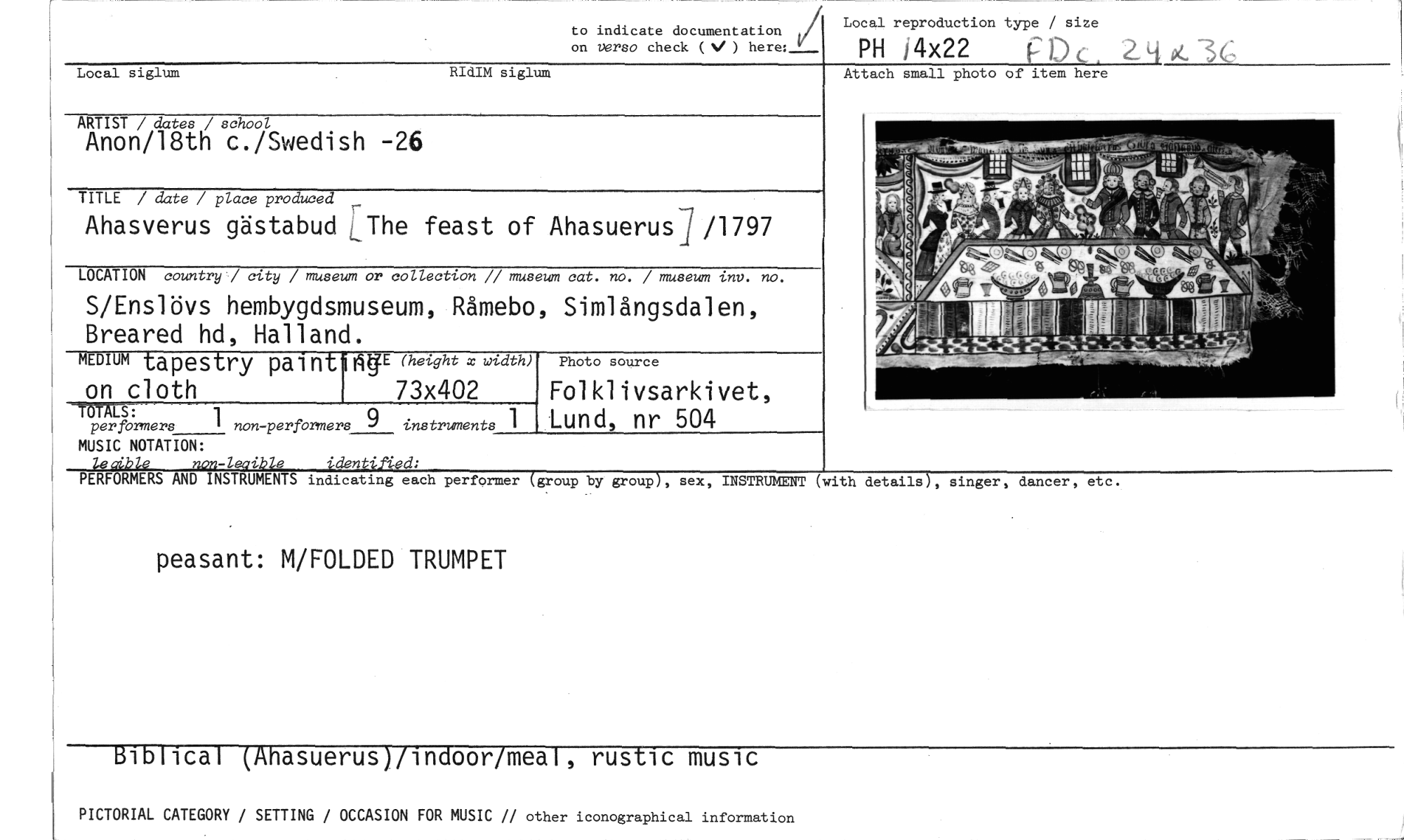 //// to indicate documentation //// on verso check ( ) here: Y: //// Local reproduction type / size //// PH 14x22 D e //// 2,4 pC3C //// Attach small photo of item here //// ARTIST / dates / school //// Anon/18th c./Swedish -26 //// TITLE / date / place produced //// Ahasverus gästabud LThe feast of Ahasuerusi /1797 //// LOCATION country / city / museum or collection // museum cat. no. / museum inv. no. //// S/Enslövs hembygdsmuseum, Råmebo, Simlångsdalen, //// Breared hd, Halland. //// MEDIUM tapestry pain-10TE (height x width) Photo source //// on cloth 73x402 Folklivsarkivet, Lund, nr 504 //// -TOTALS: 1 non-performers 9 instruments 1 //// per formers //// Local siglum //// RId M siglum //// MUSIC NOTATION: //// lecible non-leaible identified; //// PERFORMERS AND INSTRUMENTS indicating each performer (group by group), sex, INSTRUMENT (with details), singer, dancer, etc. //// peasant: M/FOLDED TRUMPET //// Biblical (Ahasuerus)/indoor/meal, rustic music //// PICTORIAL CATEGORY / SETTING / OCCASION FOR MUSIC // other iconographical information ////