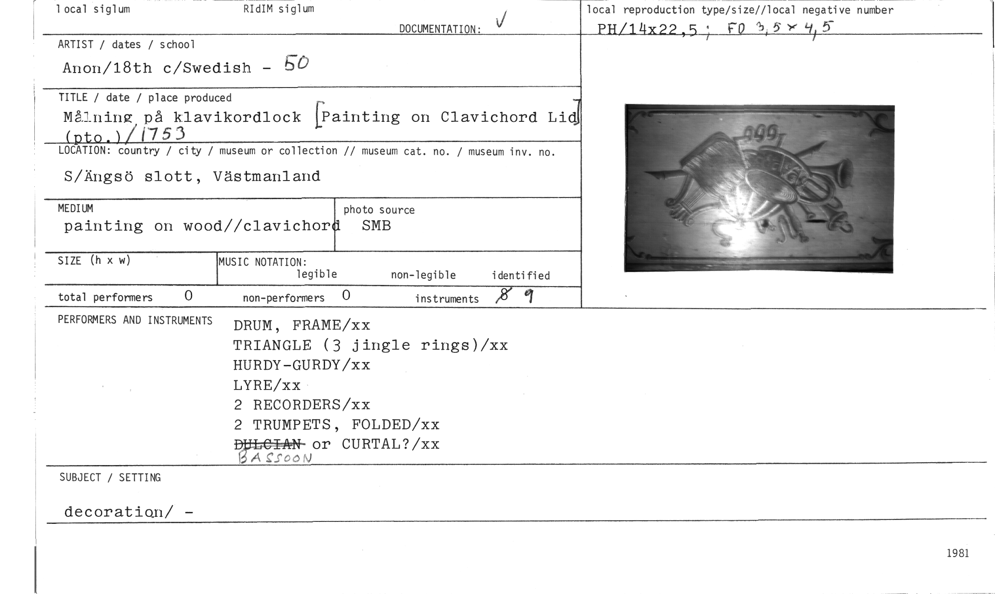 //// 1 ocal siglum RIdIM siglum //// DOCUMENTATION: //// ARTIST / dates / school //// Anon/18th c/Swedish - //// local reproduction type/size//local negative number //// PH/14x22 ,5 ° FO 3, 5 Y `Ii 5 //// TITLE / date / place produced //// Målning på klavikordlock Painting on Clavichord Lid (pto.1/1753 //// LOCATION: country / city / museum or collection // museum cat. no. / museum inv. no. //// S/Ängsö slott, Västmanland //// MEDIUM photo source //// painting on wood//clavichord SMB //// SIZE (h x w) //// MUSIC NOTATION: //// legible //// non-legible identified //// total performers 0 non-performers 0 //// instruments ; 1 //// PERFORMERS AND INSTRUMENTS //// DRUM, FRAME/xx //// TRIANGLE (3 jingle rings)/xx HURDY-GURDY/xx //// LYRE/xx //// 2 RECORDERS/xx //// 2 TRUMPETS, FOLDED/xx //// or CURTAL?/xx //// ASSooN //// SUBJECT / SETTING //// decoratiQn/ - //// 1981 ////