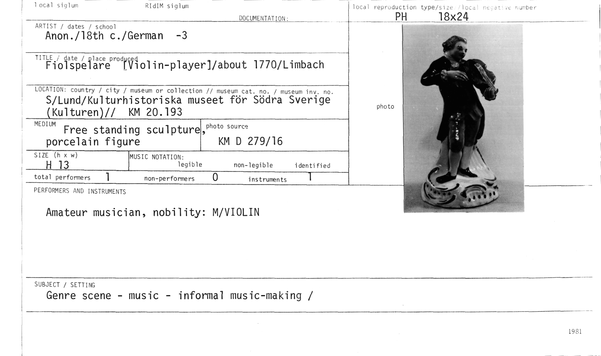 //// museum or collection // museum cat. no. / museum inv. no. //// istoriska museet för Södra Sverige KM 20.193 //// LOCATION: country / city / //// S/Lund/Kulturh //// Kulturen)// //// Free standi porcelain figu //// MEDIUM //// non-performers 0 //// instruments //// 1 ocal siglum RIdIM siglum //// DOCUMENTATION: //// ARTIST / dates / school //// Anon./18th c./German -3 //// Tinkola.stepievi;geprodtsil()_ _ n_ //// playerl/about 1770/Limbach //// SIZE (h x w) //// H 13 //// PERFORMERS AND INSTRUMENTS //// Amateur musician, nobility: M/VIOLIN //// ng sculpture re //// photo source //// KM D 279/16 //// MUSIC NOTATION: //// legible non-legible identified //// total performers 1 //// SUBJECT / SETTING //// Genre scene - music - informal music-making / //// local reproduction type/size. ilocal negative nurober //// PH 18x24 //// 1981 ////