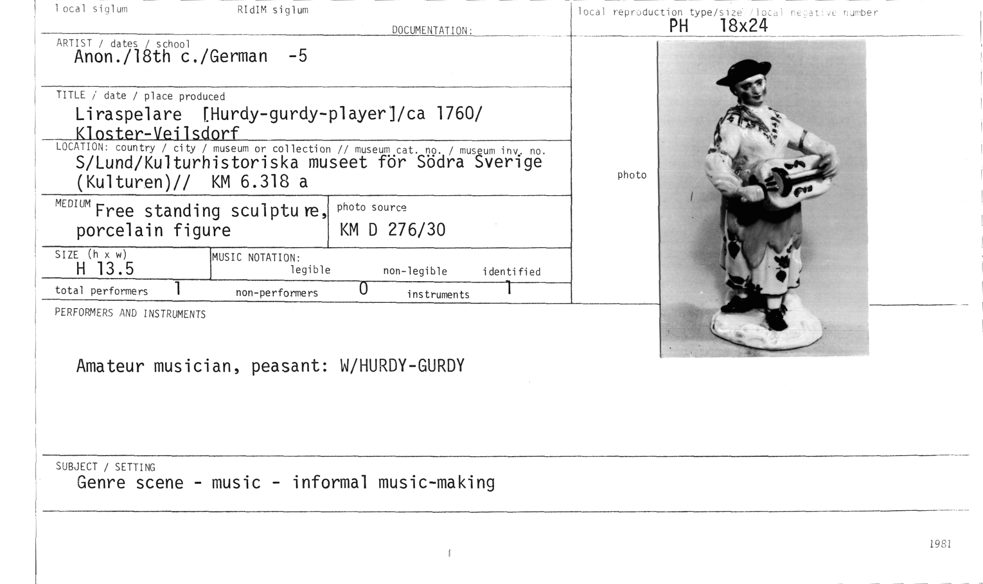 //// 1 otal siglum RIdIM siglum //// DOCUMENTATION: //// local reproduction type/size flocal ne:.,auve number //// PH 18x24 //// ARTIST / dates / school //// Anon./18th c./German -5 //// TITLE / date / place produced //// Liraspelare [Hurdy-gurdy-player]/ca 1760/ Kloster-Veilsdorf //// LOCATION: country / city / //// S/Lund/Kulturh (Kulturen)// //// MEDIUM Free standin g sculptu re, porcelain figu re //// SIZE (h x w) //// H 13.5 //// total performers 1 //// PERFORMERS AND INSTRUMENTS //// Amateur musician, peasant: W/HURDY-GURDY //// SUBJECT / SETTING //// Genre scene - music - informal music-making //// museum or collection // museum cat. no. / museum inv. no. //// istoriska museet för Södra Sverige KM 6.318 a //// MUSIC NOTATION: //// legible //// non-performers 0 instruments 1 //// photo source //// KM D 276/30 //// non-legible identified //// photo //// 1981 ////