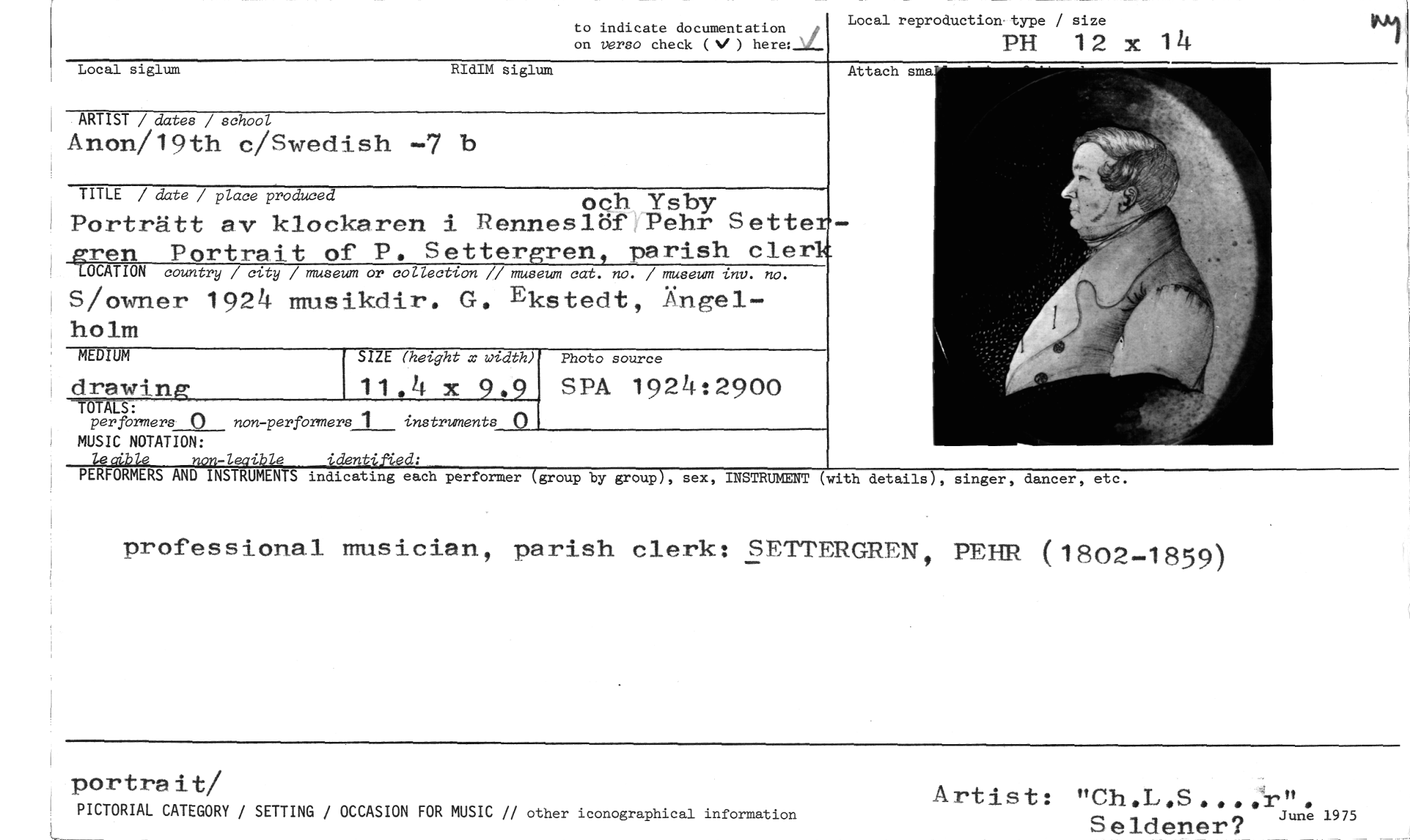 //// PI //// to indicate documentation on versa check (%1 ) here: //// Local reproduction type / size //// PH 12 x 14 //// Local siglum RIdIM siglum //// ARTIST / dates / school //// Anon/19th c/Swedish —7 b //// TITLE / date / place produced och. Ysby //// Porträtt av klockaren i Renneslöf Pehr Setter //// grengren Portrait of P. Settergren, parish clerk country / city / museum or collection // museum cat. no. / museum inv. no. S/owner 1924 musikdir. G. Ekstedt, _Ängel- //// holm //// MEDIUM SIZE (hetght x eutdth) //// drawing 11.4 x 9.9 //// -Tarm: //// per formers- () non-perfermers 1 instruments //// MUSIC NOTATION: //// leaib/e non-leaible i„dentifted: //// PERFORMERS AND INSTRUMENTS //// Photo source //// SPA 1924:2900 //// Attach sma //// indicating each performer (group by group), sex, INSTRUMENT (with details), singer, dancer, etc. //// professional musician, parish clerk: SETTERGREN, PEHR (1802-1859) //// portrait/ Artist: "Ch.L.S...r". //// PICTORIAL CATEGORY / SETTING / OCCASION FOR MUSIC // other iconographical information June 1975 //// Seldener? ////